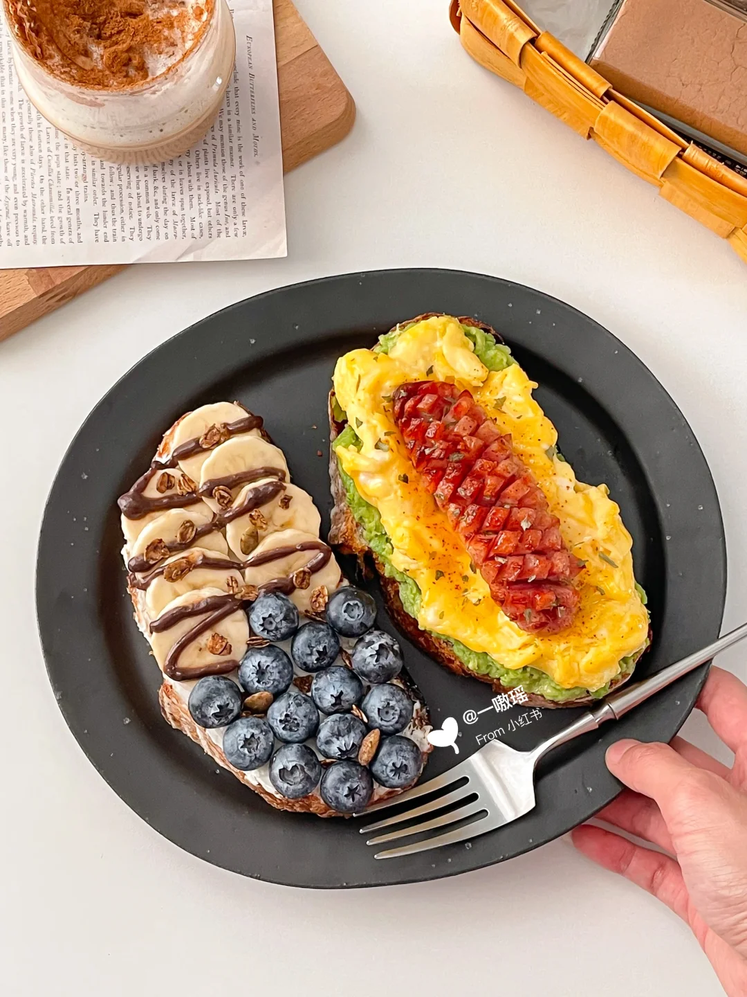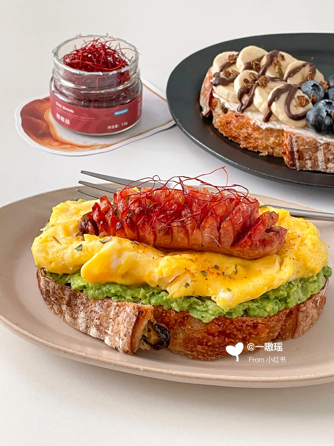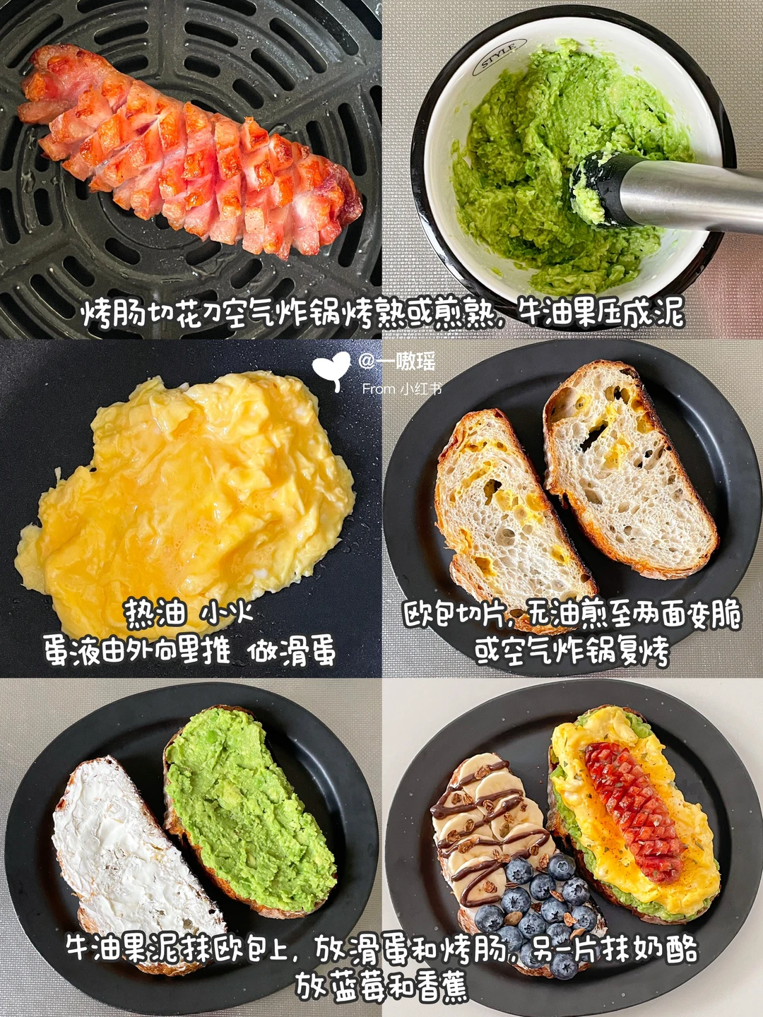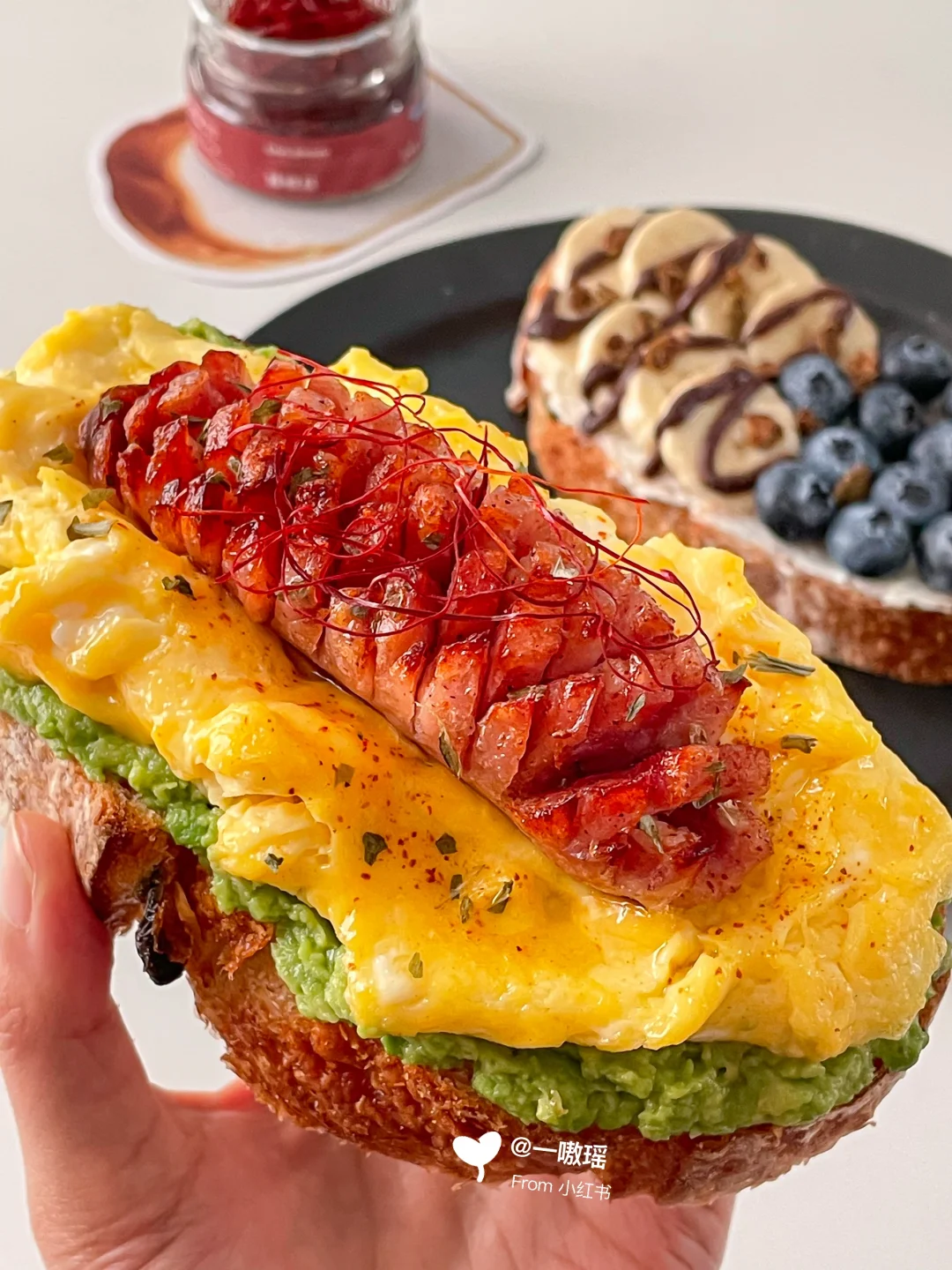 早餐就要简单!快手!营养全! 甜咸双拼开放式三明治请收下🥖 - 今日搭配公式 • :* 🌭🫐🍌🍳 🥑•:*・ ❶欧包+牛油果+滑蛋+烤肠 ❷欧包+抹奶酪+香蕉+蓝莓 👩🏻🍳做法 ▫️牛油果压成泥 ▫️烤肠切花刀煎熟或烤熟 ▫️两个鸡蛋打散(加20g牛奶口感更嫩)做滑蛋 ▫️食材如图依次堆叠起来 ▫️另一片欧包抹一层奶酪 ▫️放香蕉片和蓝莓,香蕉上淋巧克力酱