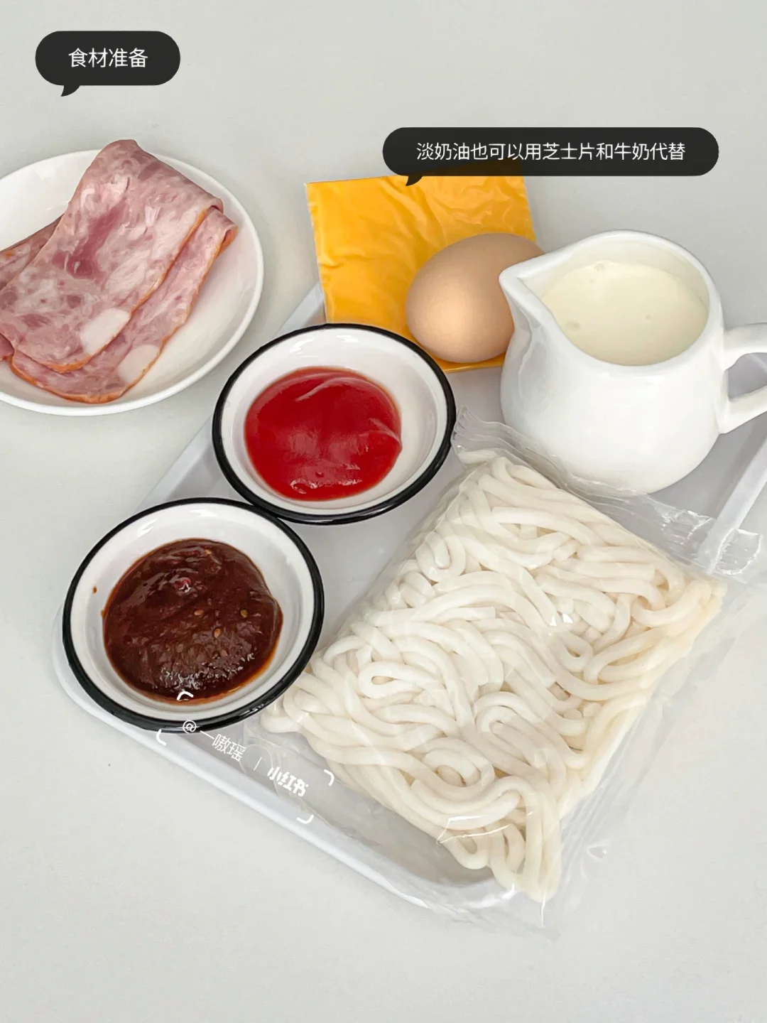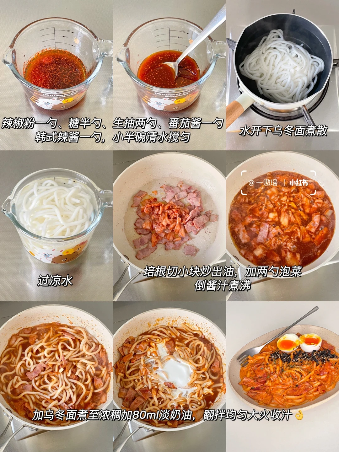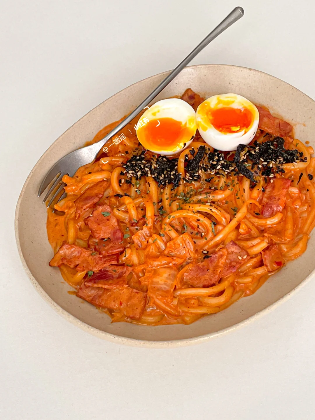 黏糊糊的乌冬面真的没法拒绝🍜 每一根面条子都裹满了浓浓的酱汁🥺 香辣过瘾,奶香浓郁!好吃到停不下来‼️ - 🛒食材 乌冬面 培根 韩式泡菜 韩式辣酱 番茄酱 淡奶油 👩🏻🍳做法 ▫️ 辣椒粉一勺、糖半勺、生抽两勺、番茄酱一勺、韩式辣酱一勺,小半碗清水搅匀 ▫️ 水开下乌冬面煮散过冷水 ▫️ 培根切小块炒出油,加两勺泡菜,倒酱汁煮沸 ▫️ 加乌冬面煮至浓稠加80ml淡奶油,翻拌均匀大火收汁