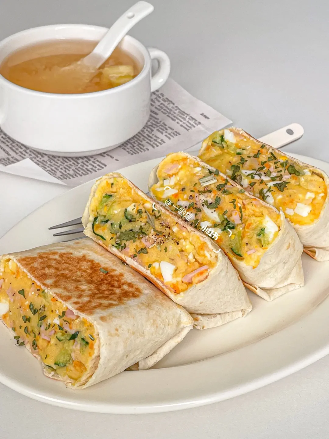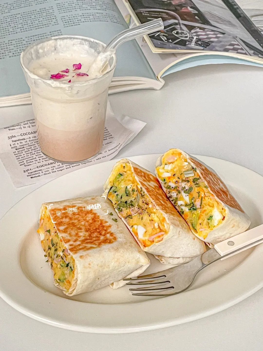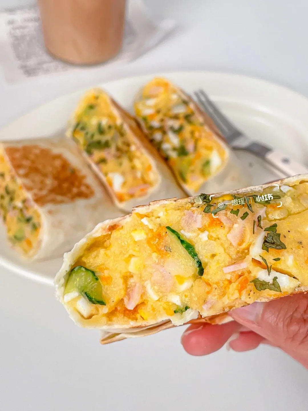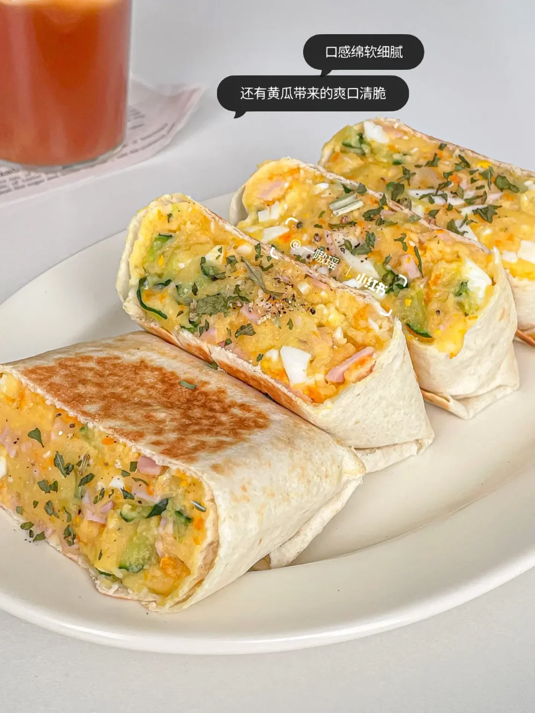 这个日式土豆泥沙拉卷饼真的绝绝子!做法简单零失败,低脂饱腹还解馋😭 酸甜柔和,绵软细腻,还有黄瓜带来的爽口清脆,连吃三天都不腻 你们一定要试试 - 🛒食材 土豆🥔250g 胡萝卜🥕小小一根 黄瓜🥒小半根 水煮蛋🥚2个 饼皮🫓两张 火腿🐖3-5片 沙拉酱、黑胡椒适量 👩🏻‍🍳做法 •土豆、胡萝卜蒸熟压泥,加入水煮蛋捣碎、拌匀 •加入火腿碎、黄瓜薄片、黑胡椒、沙拉酱拌匀 •饼皮在室温软化后,加入土豆泥沙拉,四周向内包好 •平底锅无油小火煎至双面金黄(定型)即可 - 这款鸡蛋土豆泥沙拉卷饼,不管是减脂期还是日常早餐,外出露营⛺️也可以做好带上,口感绵密,好吃不腻口。 用这个沙拉做成三明治🥪也很好吃😋 搭配了一杯玫瑰红茶奶盖🥤也就是红茶玛奇朵,奶盖打过了,不过搅匀后一样好喝!(下次注意😭) 搓手手开动啦🍽
