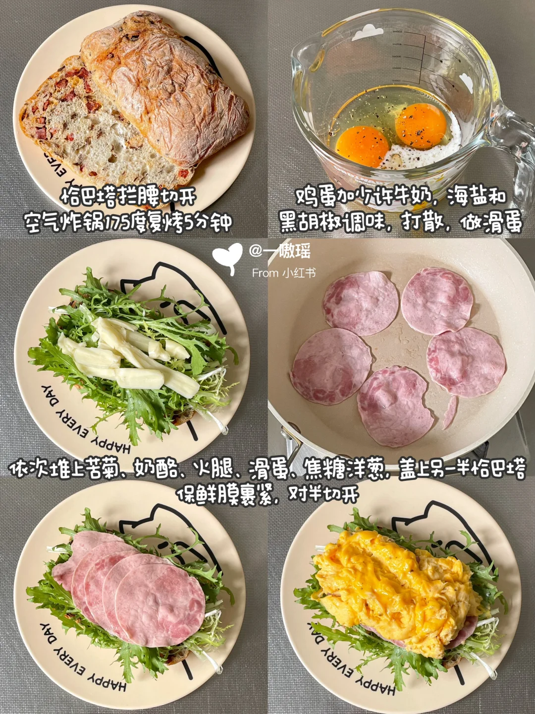 吃不腻的欧包&恰巴塔三明治搭配 简单快手,咸甜都有✨ 稳定食欲营养全面🥖🥑🧀🥓🫐 〰️ ❶ 欧包+牛油果+滑蛋+烤肠 欧包+奶酪+香蕉+蓝莓 ❷ 欧包+口蘑炒培根+奶酪碎+小香葱 欧包+牛油果泥+芝士片+煎糯米肠 ❸ 恰巴塔|牛肉|小番茄|鸡蛋|洋葱|蒜头 ❹ 恰巴塔|火腿片|泡菜|鸡蛋|生菜 ❺ 恰巴塔|洋葱|鸡蛋|芝麻菜|奶酪|火腿片 ❻ 恰巴塔|苦菊|西红柿|和牛|洋葱|泡菜|芝士片|奶油|韩式辣酱