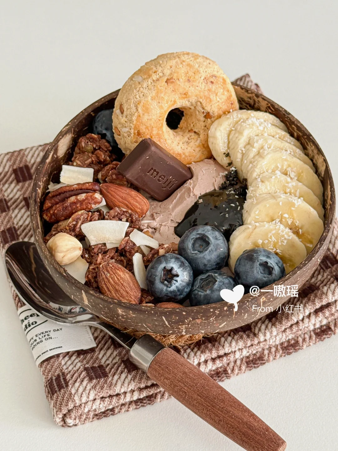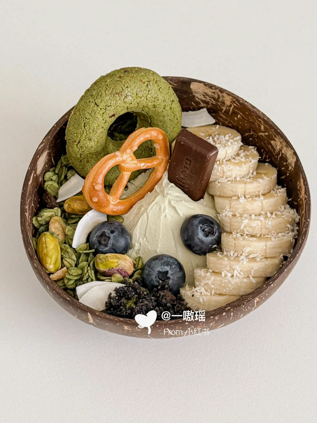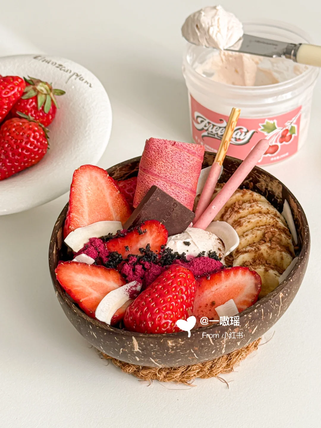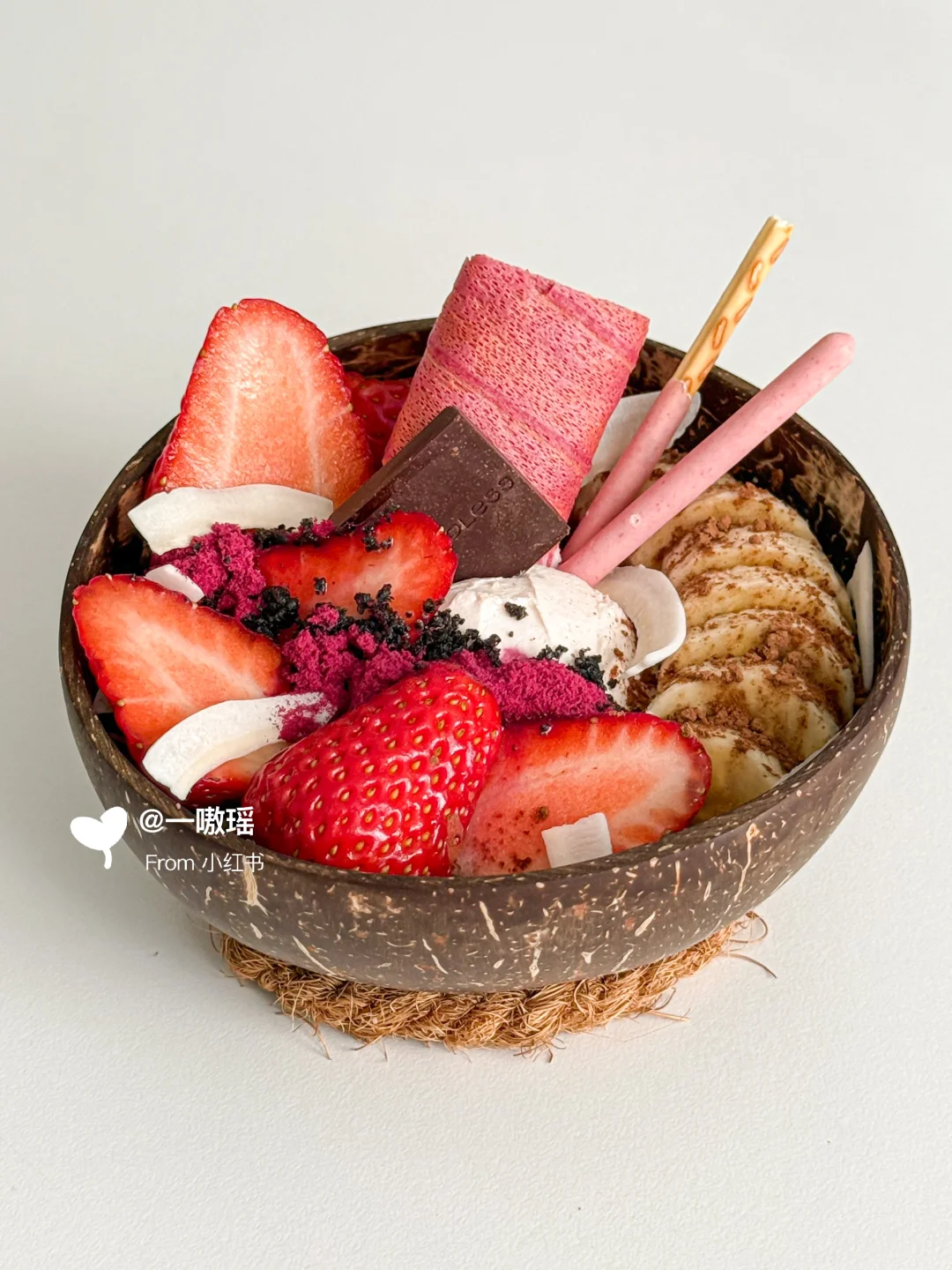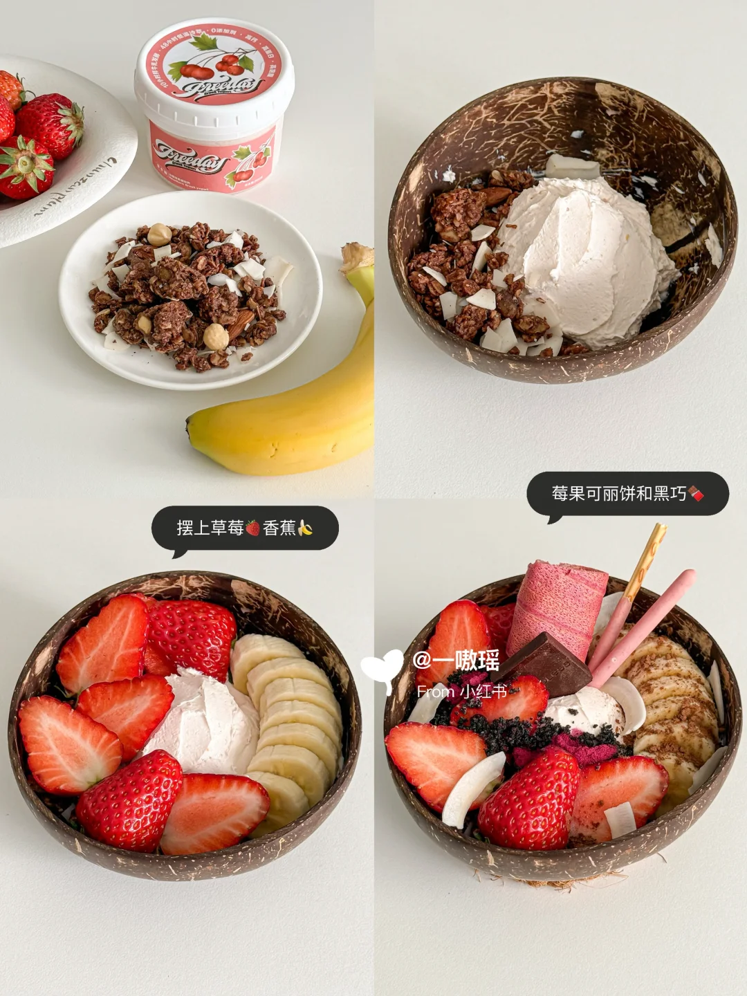 草莓+香蕉+黑巧+希腊酸奶+巧克力烘焙燕麦+巴西莓粉+可可粉+椰子脆片