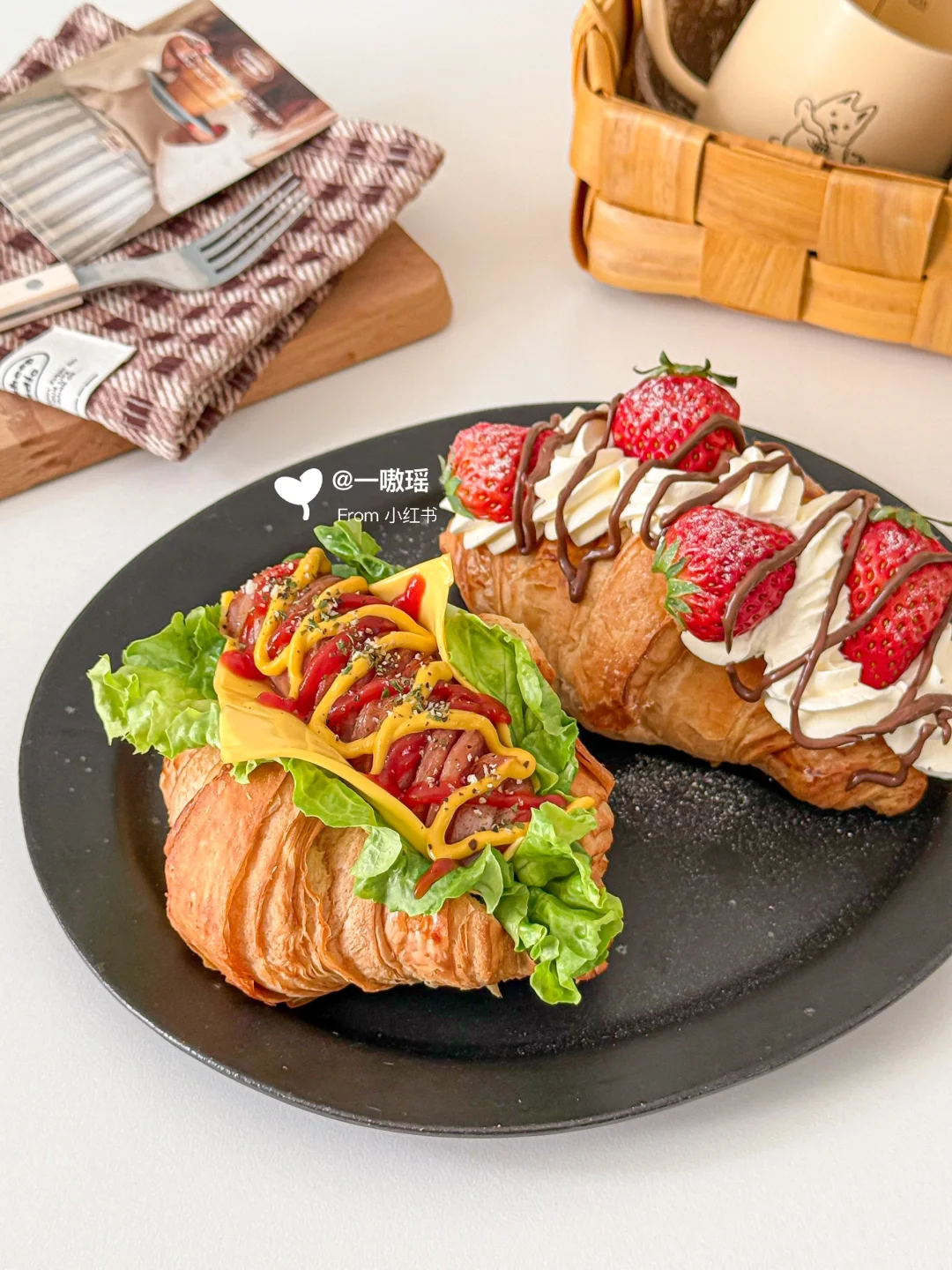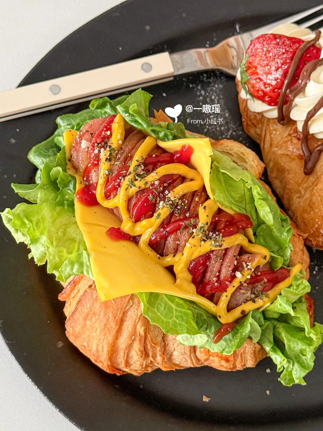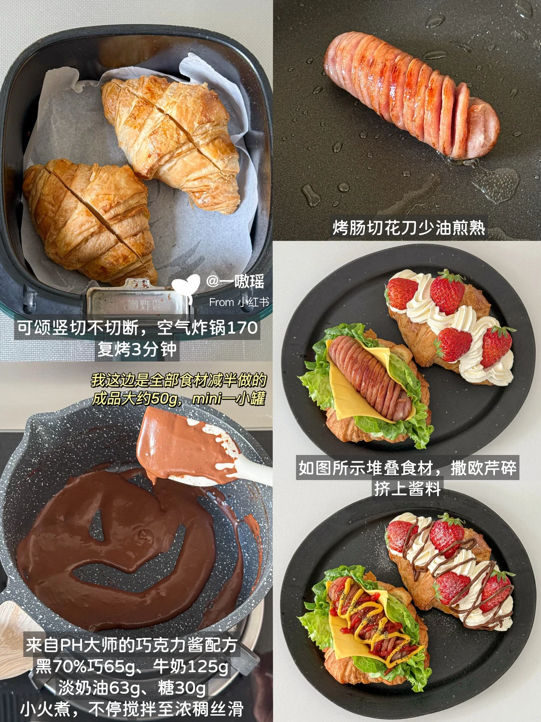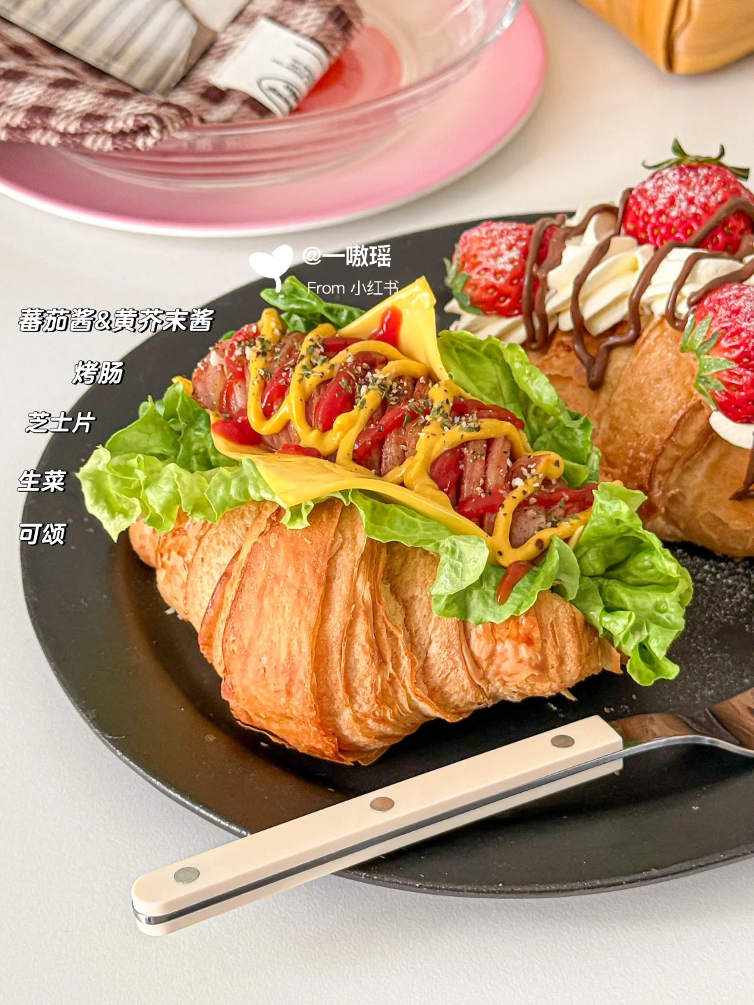 早午餐就要简单!快手!营养全! 咸鲜juicy的烤肠搭配浓郁奶香的芝士🧀草莓奶油叠加巧克力酱🍓一口接一口停不下来超过瘾!! 经典搭配一段时间不吃就会想😍 - 🛒食材 🌭烤肠可颂三明治 可颂|烤肠|芝士片|生菜|番茄酱|蜂蜜芥末酱 🍓草莓奶油可颂三明治 可颂|奶油|草莓|自制巧克力酱 👩🏻🍳做法 ▫️可颂竖切不切断,空气炸锅170复烤3分钟 ▫️烤肠切花刀少油煎熟 ▫️如图所示堆叠食材,撒欧芹碎,挤上酱料