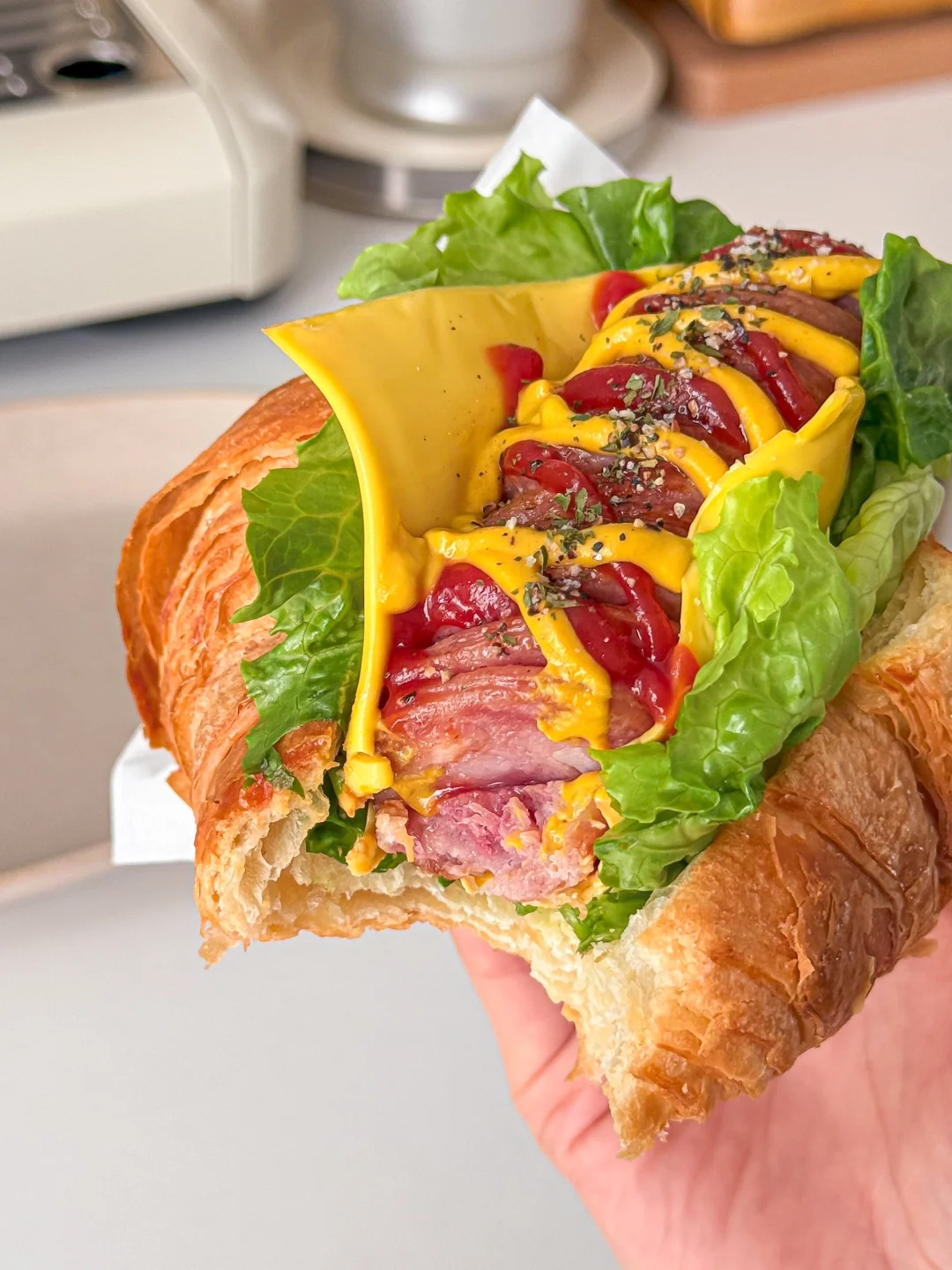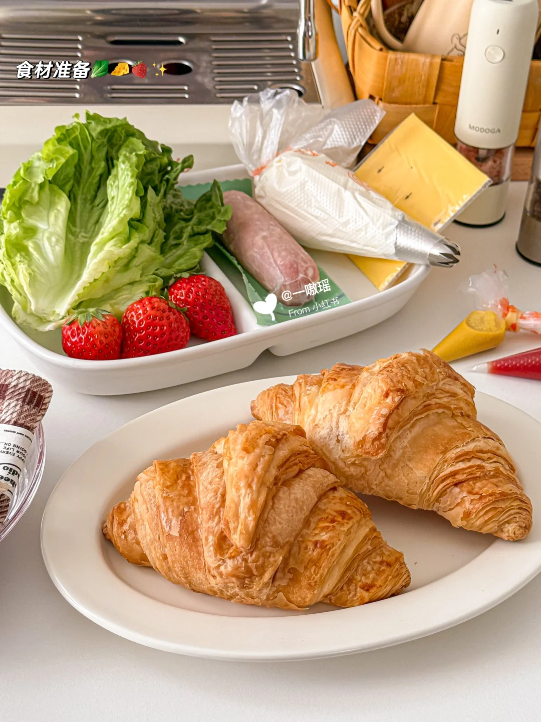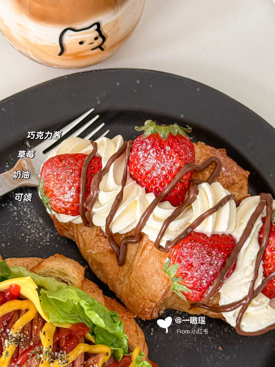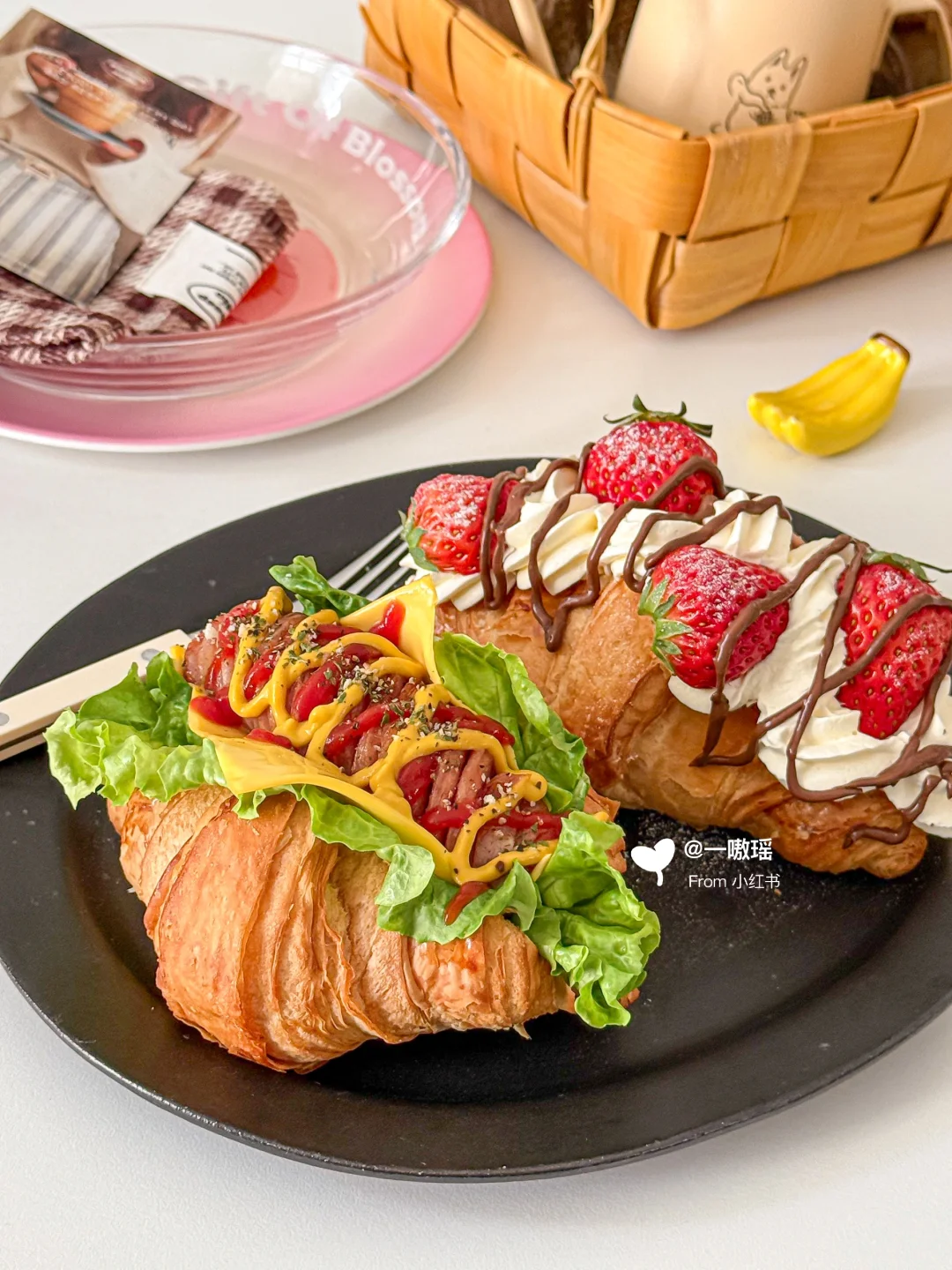 早午餐就要简单!快手!营养全! 咸鲜juicy的烤肠搭配浓郁奶香的芝士🧀草莓奶油叠加巧克力酱🍓一口接一口停不下来超过瘾!! 经典搭配一段时间不吃就会想😍 - 🛒食材 🌭烤肠可颂三明治 可颂|烤肠|芝士片|生菜|番茄酱|蜂蜜芥末酱 🍓草莓奶油可颂三明治 可颂|奶油|草莓|自制巧克力酱 👩🏻🍳做法 ▫️可颂竖切不切断,空气炸锅170复烤3分钟 ▫️烤肠切花刀少油煎熟 ▫️如图所示堆叠食材,撒欧芹碎,挤上酱料