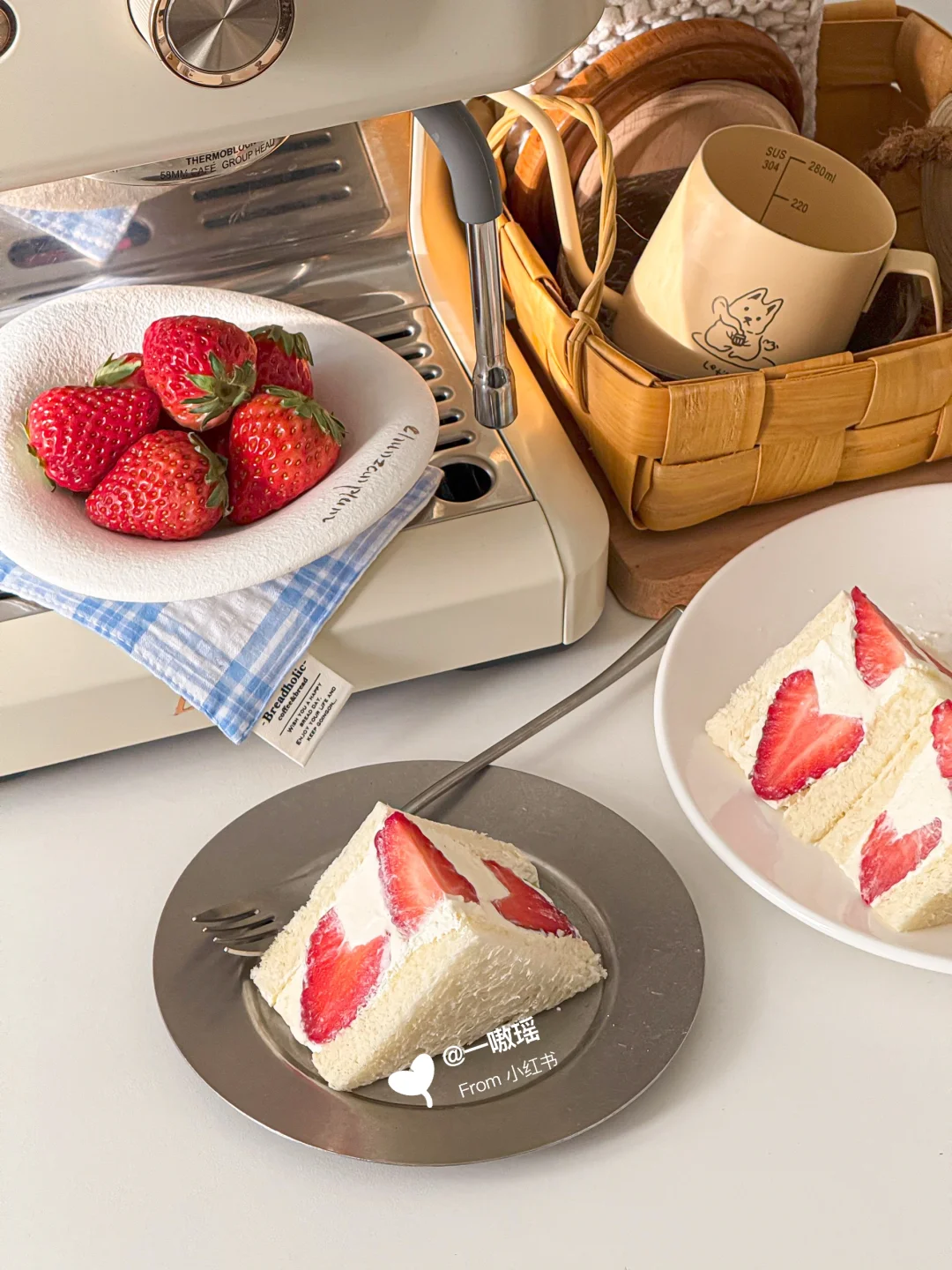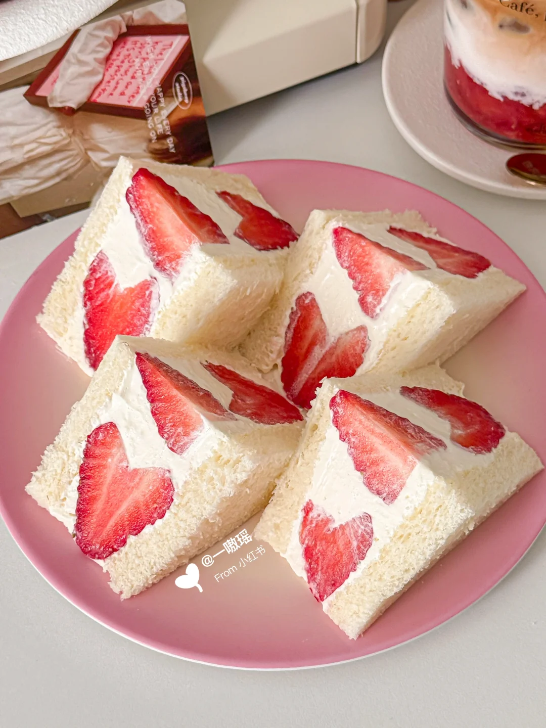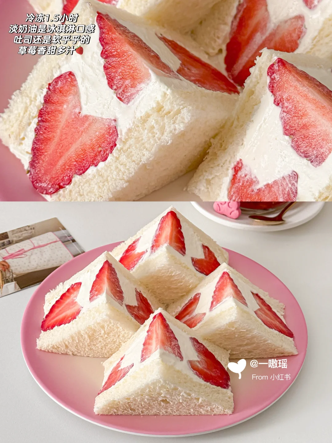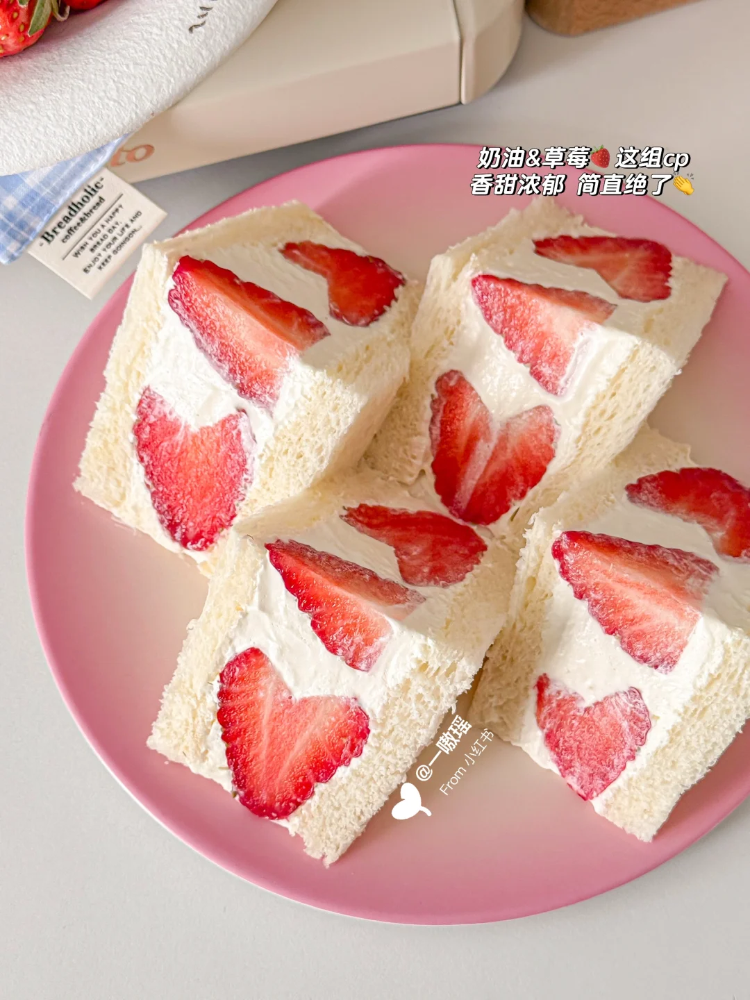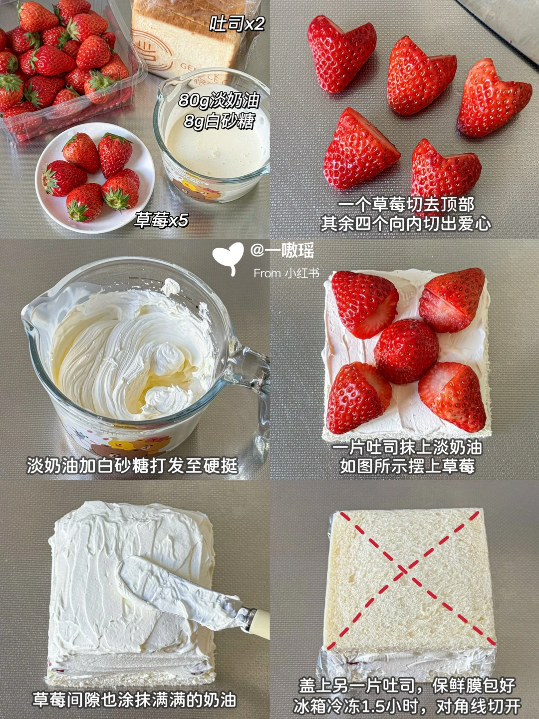 草莓&奶油的组合真的超级美味!🍓 香甜浓郁🤤是一款幸福感爆棚的“甜品”三明治 冷冻一个半小时后奶油还有点儿冰淇凌的口感🍦 好满足🥰 - 🛒食材 吐司x2|草莓x5|淡奶油80g|白砂糖8g 👩🏻🍳做法 ▫️一个草莓切去顶部,其余四个向内切出爱心 ▫️淡奶油加白砂糖打发至硬挺 ▫️一片吐司抹上淡奶油,如图所示摆上草莓 ▫️草莓间隙也涂抹满满的奶油 ▫️盖上另一片吐司,保鲜膜包好,冰箱冷冻1.5小时,对角线切开