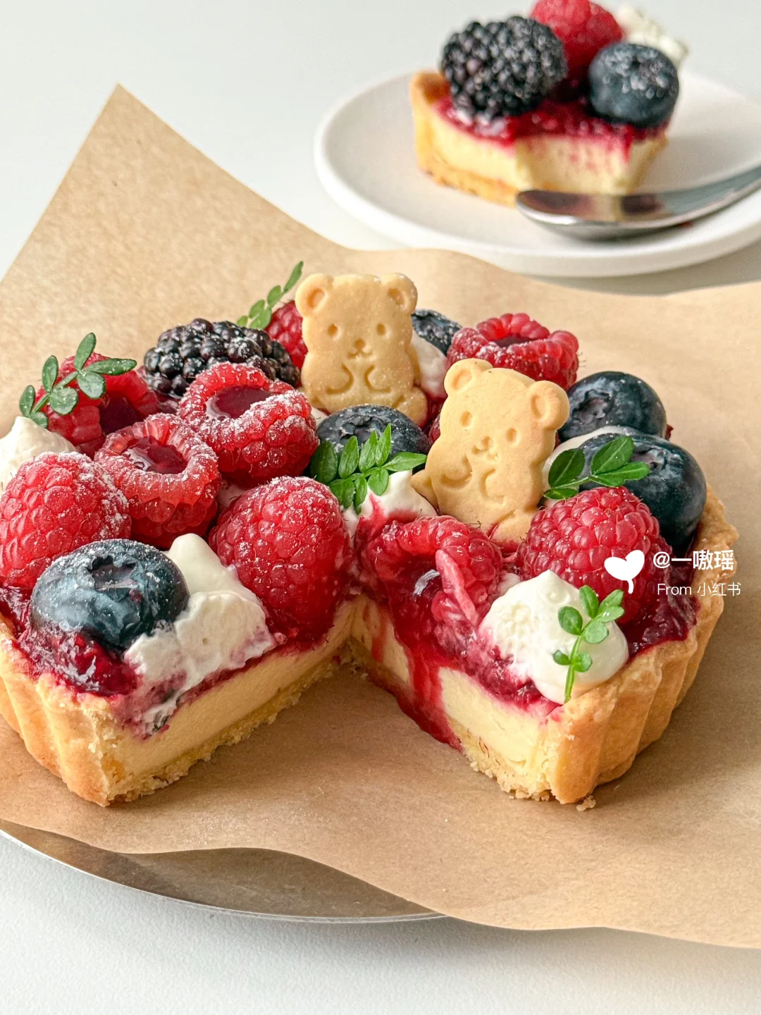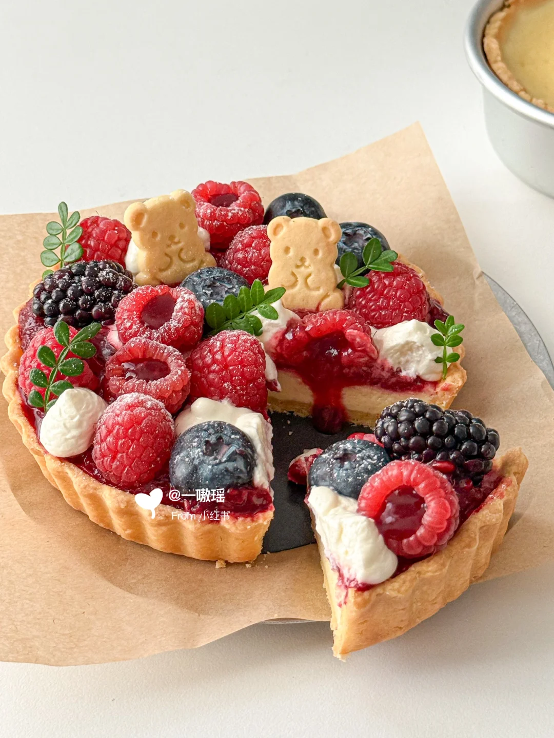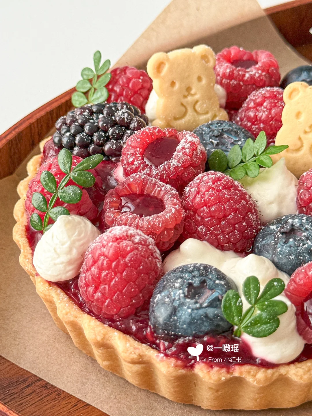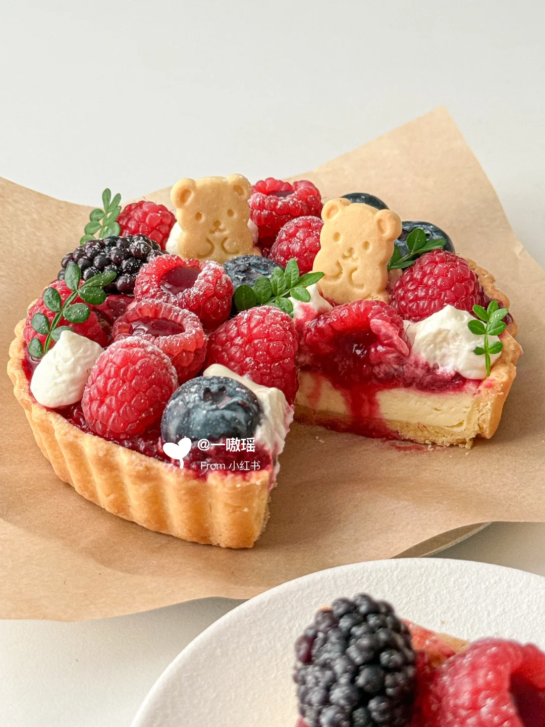 ▫️出炉稍微晾凉,抹一层树莓果酱,铺满莓果即可(冷藏后也好吃😋)