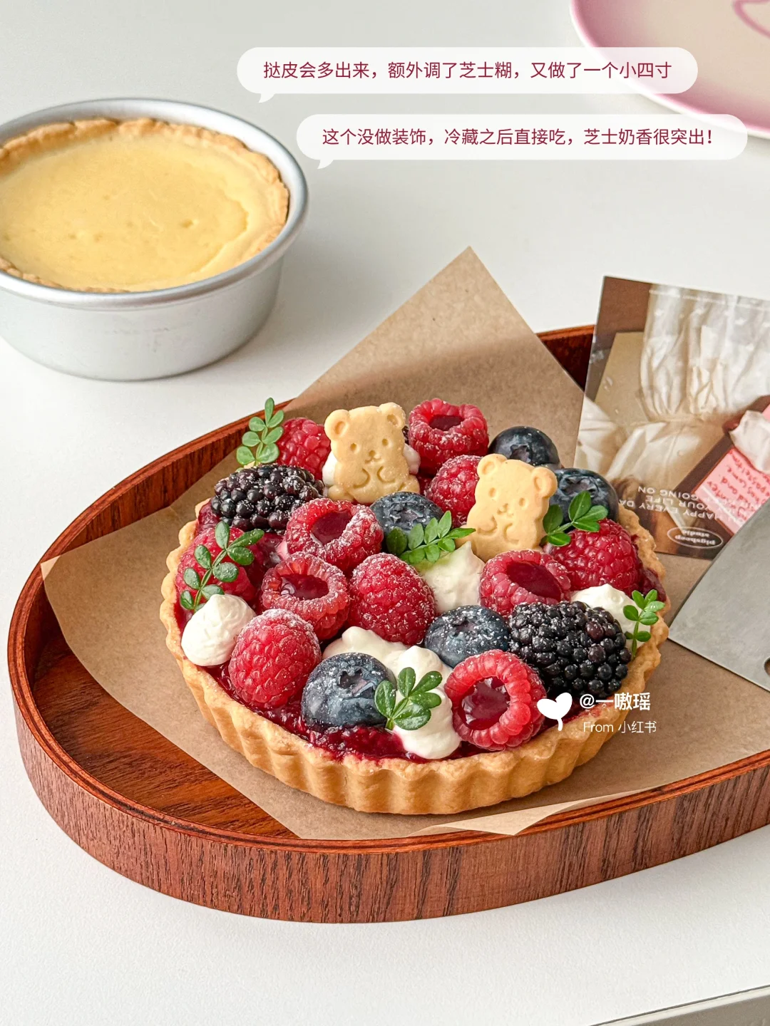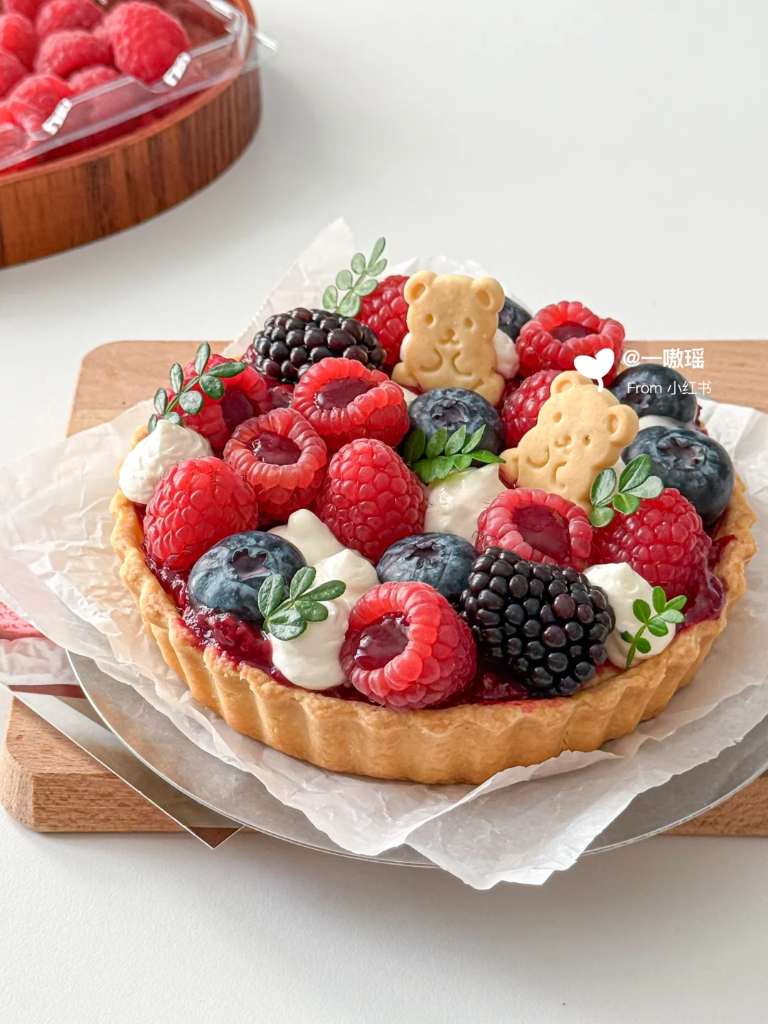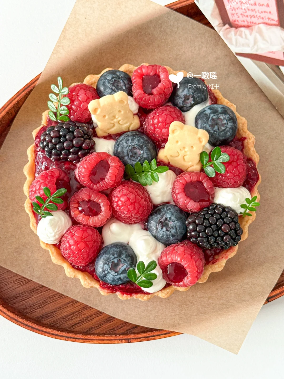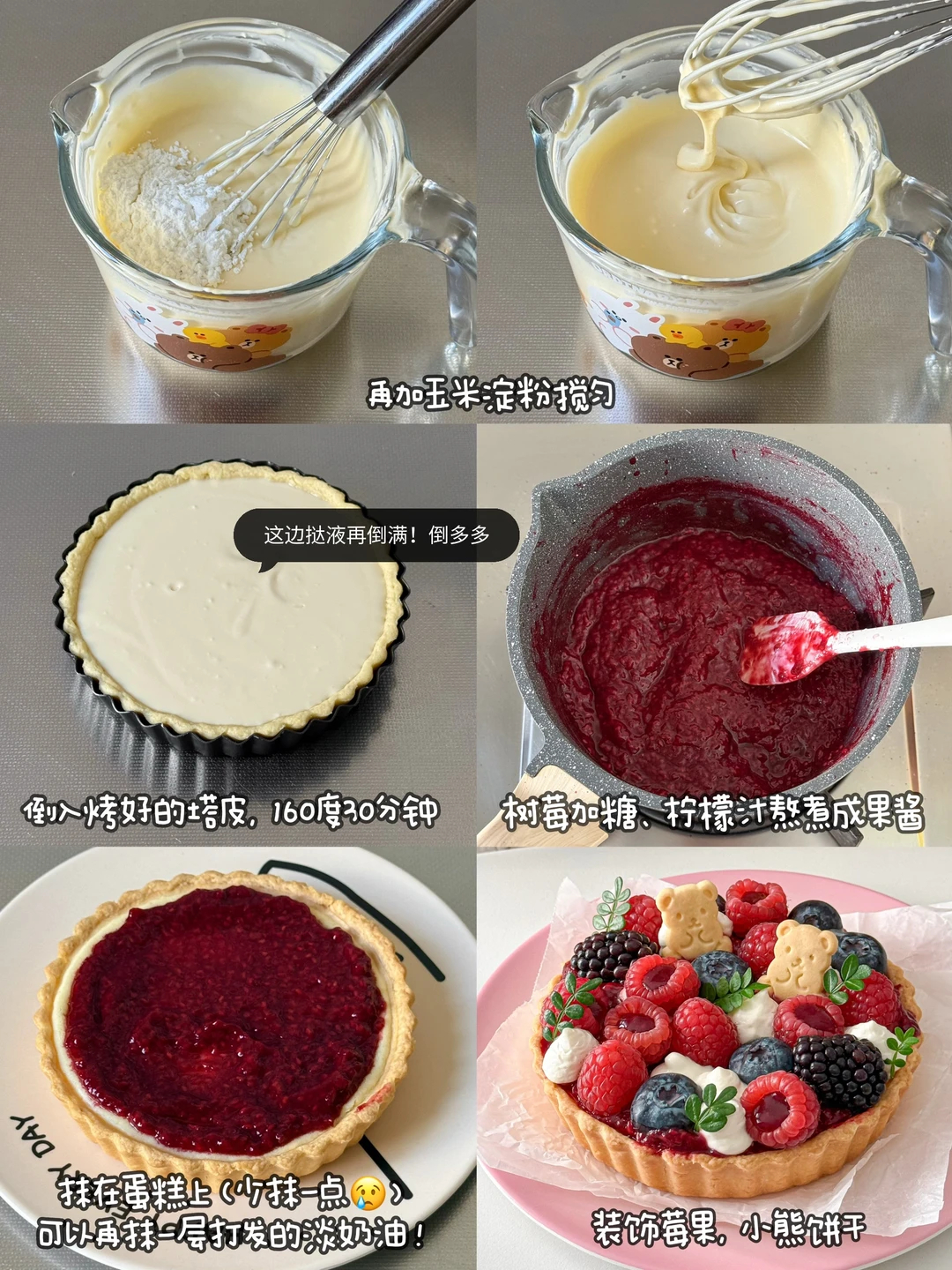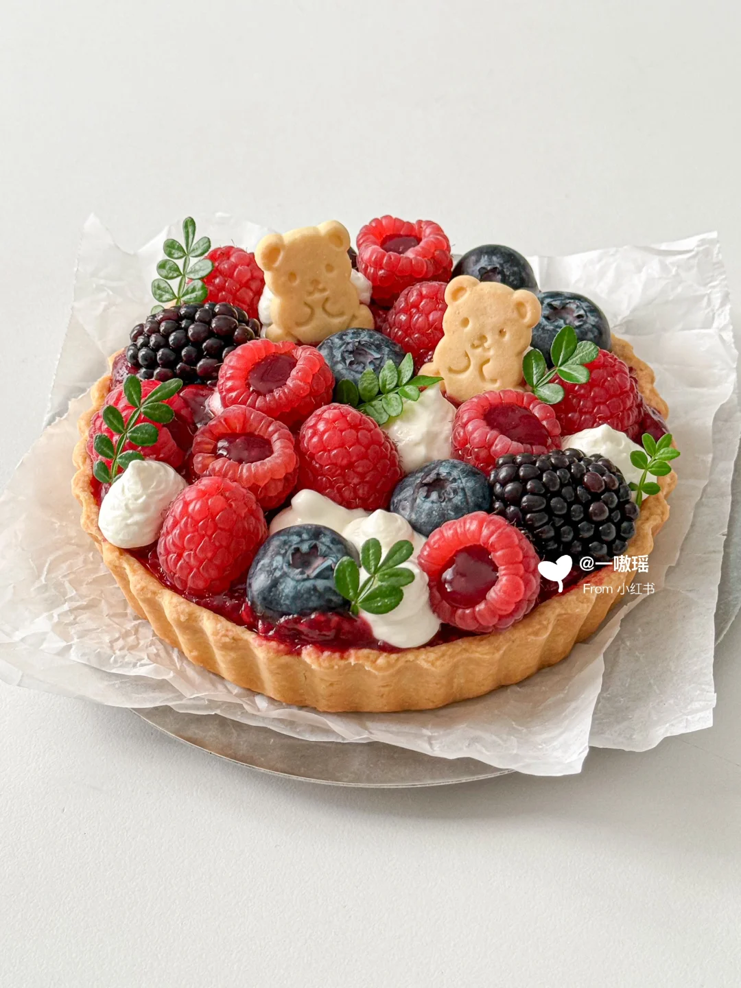 ▫️出炉稍微晾凉,抹一层树莓果酱,铺满莓果即可(冷藏后也好吃😋)