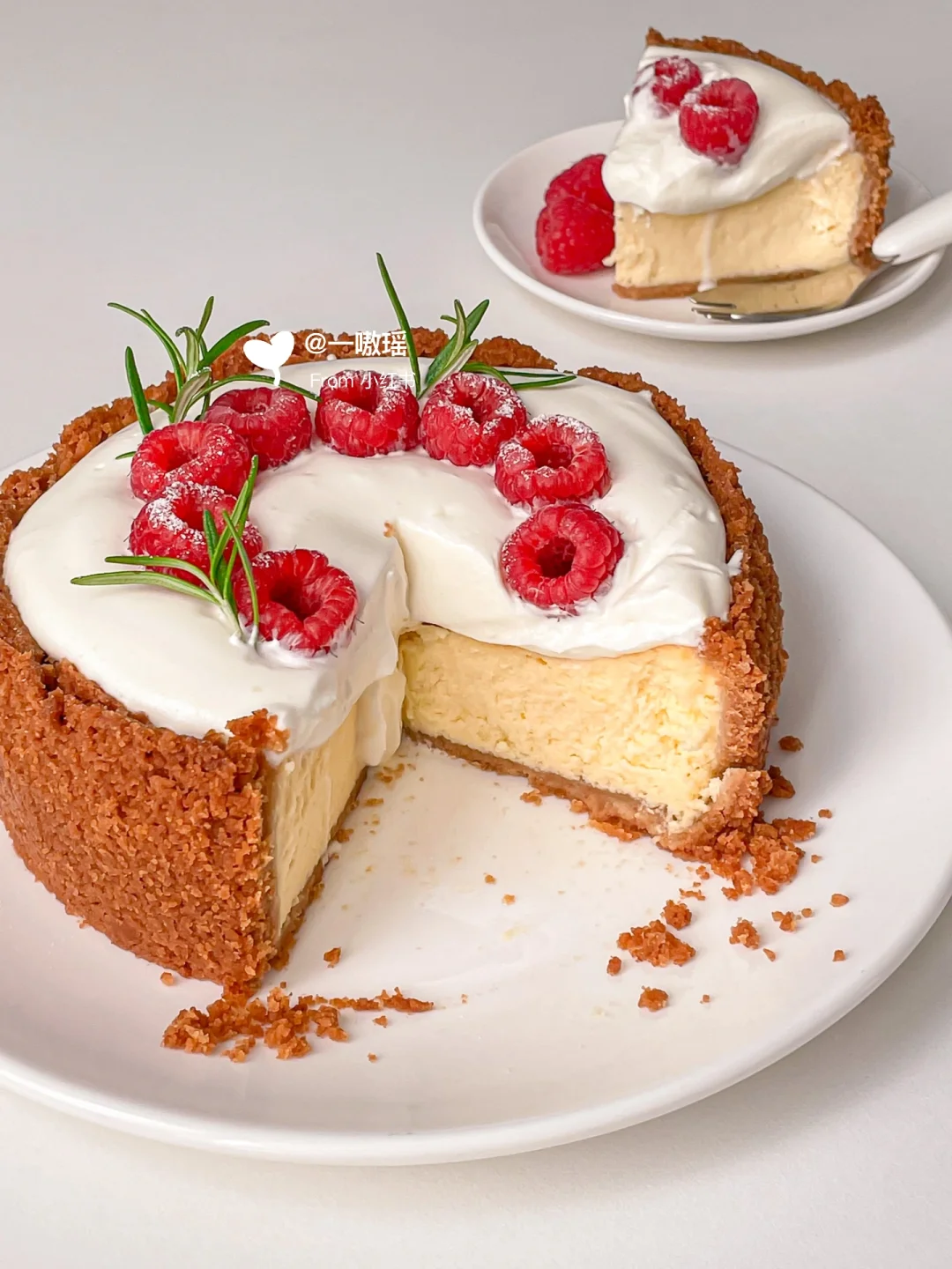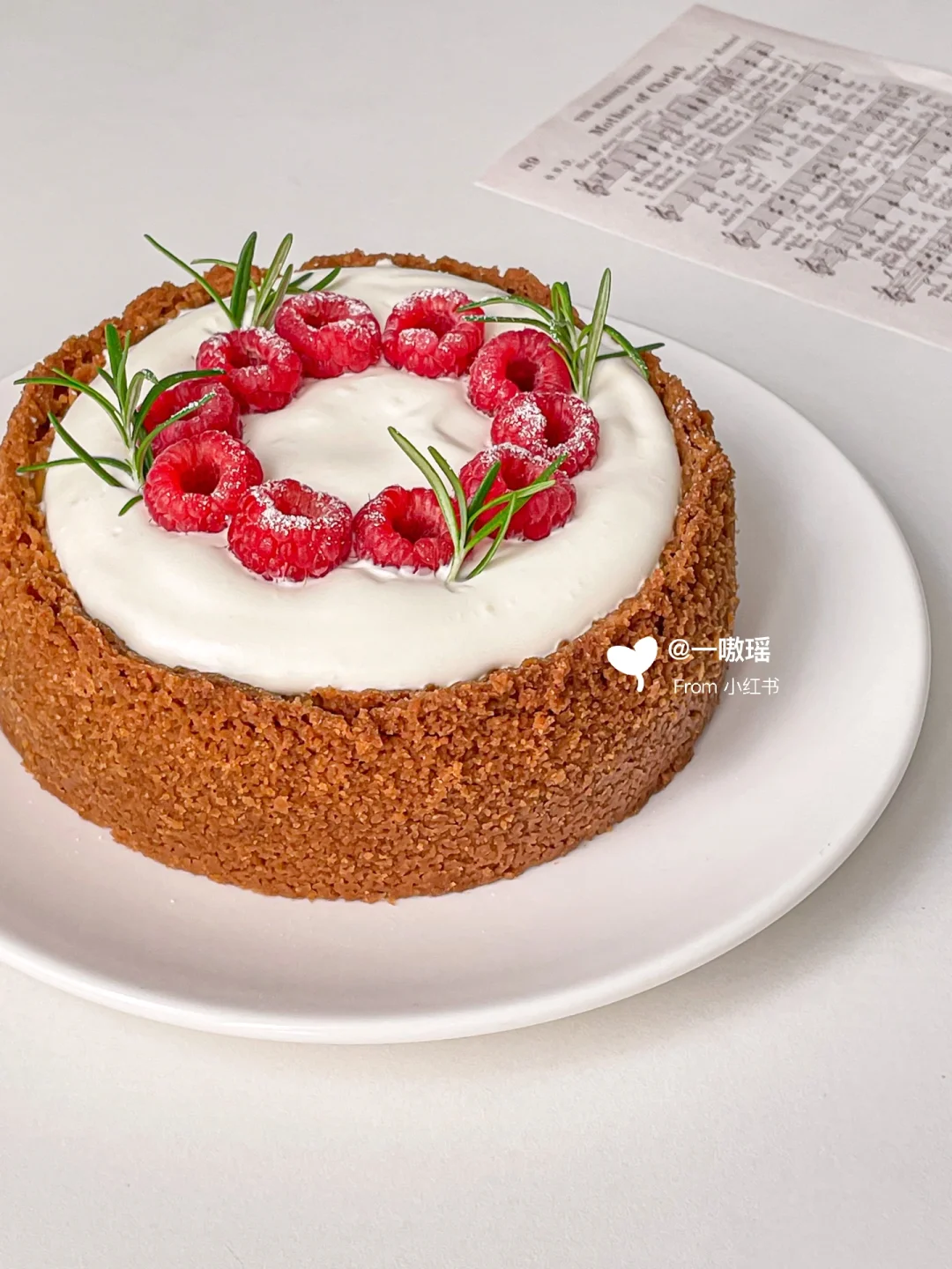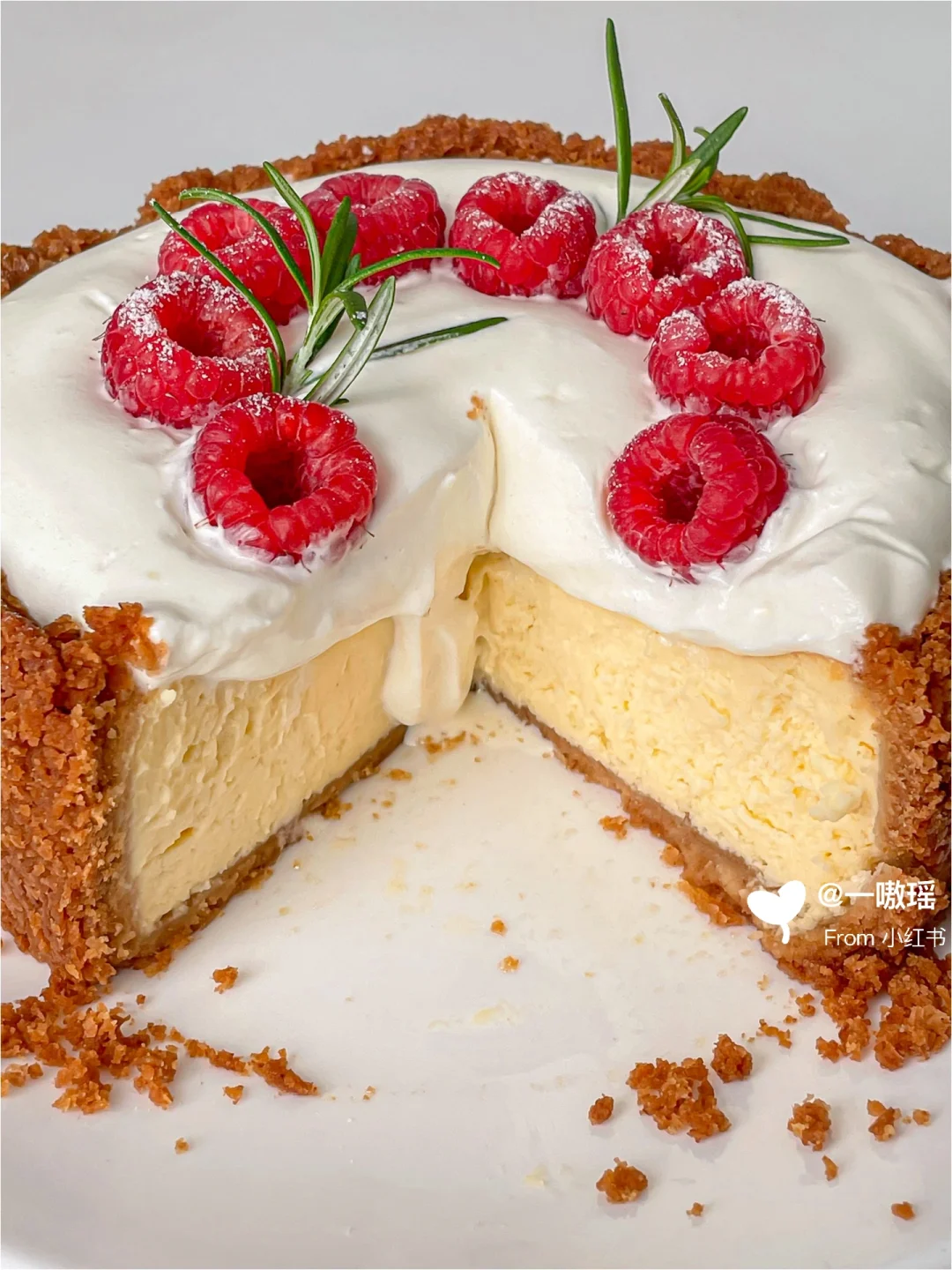 ▫️80g奶油加一点糖打发淋在蛋糕表面,装饰树莓、迷迭香