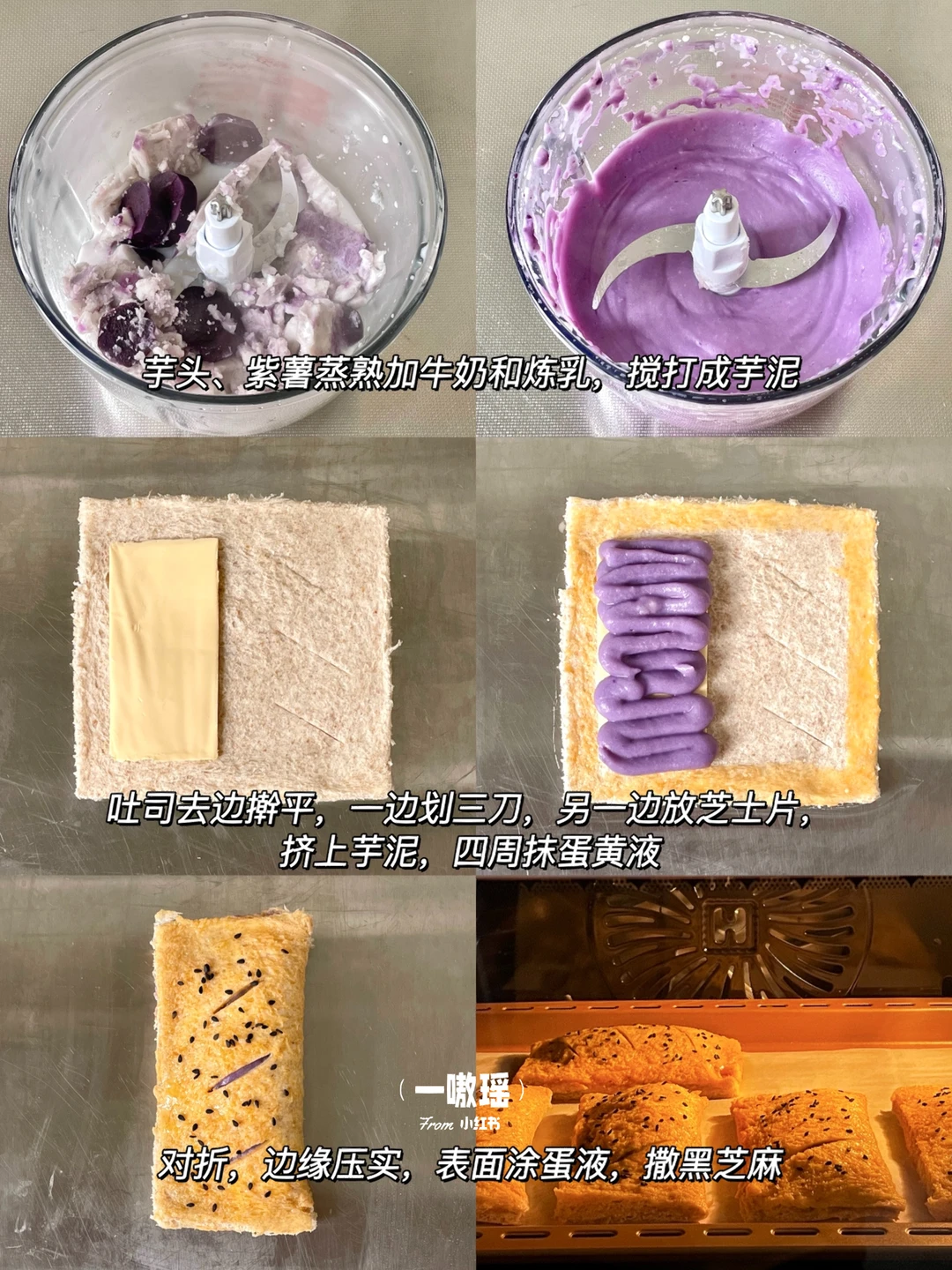 超级简单的美味减脂早餐!吐司烤的酥脆,内里是奶香浓郁软绵绵的芋泥,加上芝士,很难不爱上!💜芋泥脑袋必须冲 - 🛒食材 吐司 荔浦芋头 紫薯 牛奶 炼乳 芝麻 👩🏻🍳做法 •芋头、紫薯蒸熟加牛奶、炼乳搅打成泥 •吐司去边,擀平,一边划三刀,另一边放芝士片 •挤上芋泥,四周抹蛋黄液 •对折捏紧边缘,表面涂蛋液撒芝麻,烤箱上下管170度8分钟