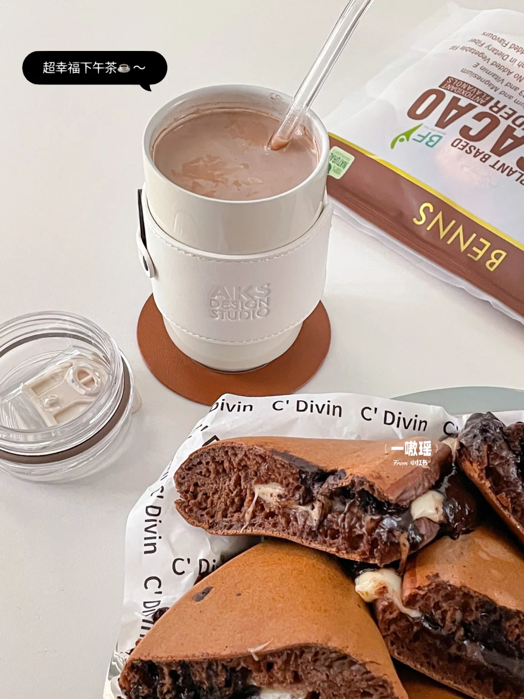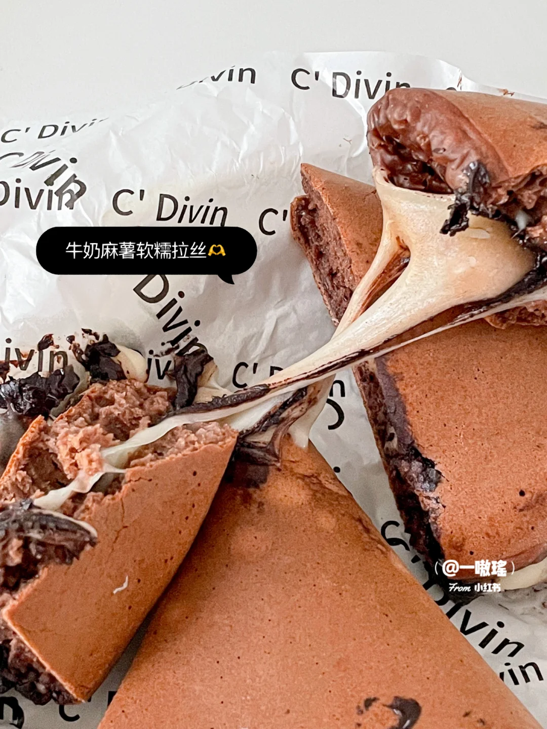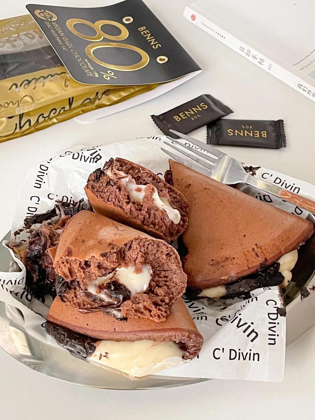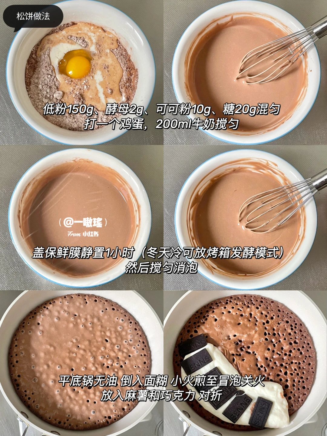 一口爆浆的巧克力厚松饼🍫夹着软糯拉丝的牛奶麻薯 好吃哭了😭 搅一搅就成功的小甜品,低卡饱腹,早餐或者下午茶都很合适🍴🥞 - 🛒食材 低筋面粉150g 酵母2g 可可粉10g 糖20g 鸡蛋一个 牛奶200ml 黑巧6块 👩🏻‍🍳做法 ·低粉、酵母、可可粉、糖混合匀 ·加入200ml牛奶 打一个鸡蛋搅匀 ·盖保鲜膜静置一小时(冬天冷可放烤箱发酵模式) ·搅匀消泡 ·平底锅无油倒入面糊 小火煎至表面密集冒泡关火 ·放上麻薯和巧克力对折出锅,切开就可以享用了~ - 厚松饼里用到的BENNS的80%黑巧🍫甜味来自红糖和香荚兰,高可可含量使得巧克力愈发香醇,一点甜味都不爱的宝子可以试试99.9%