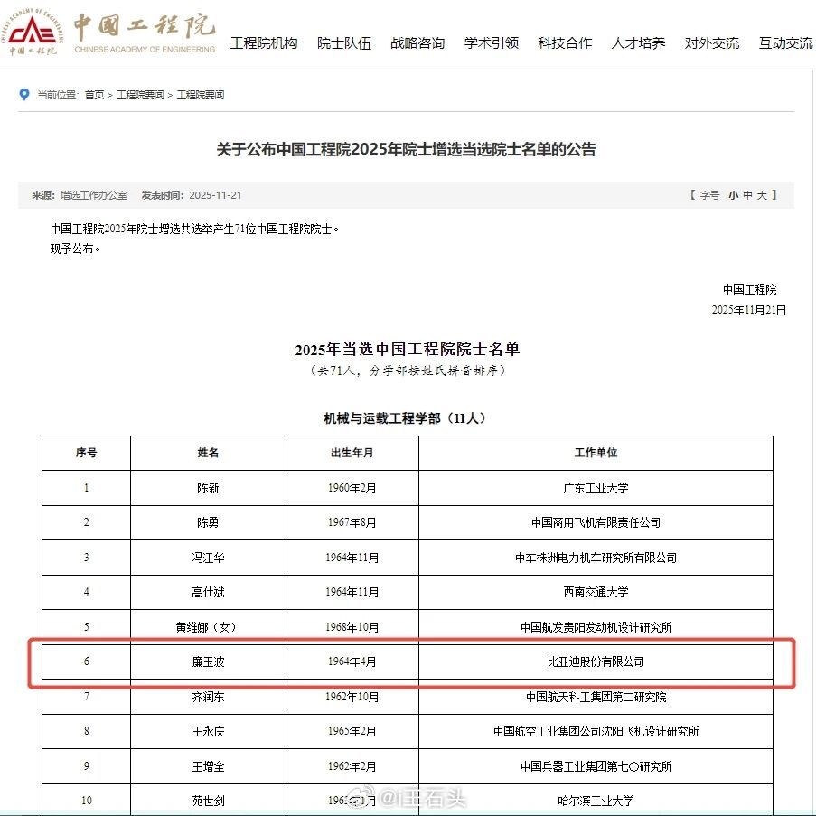 比亚迪集团首席科学家廉玉波当选中国工程院院士
