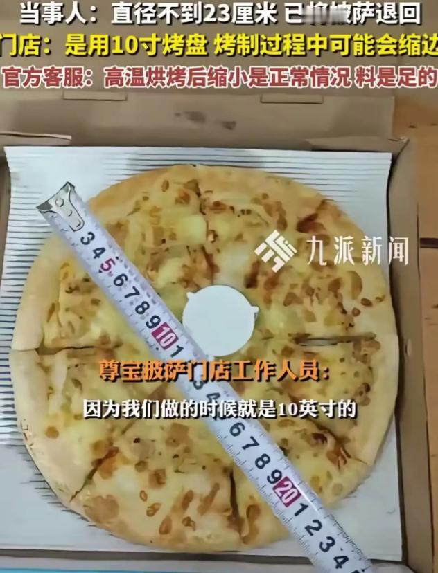 “终于有人较真了!”男子在尊宝披萨购买了10寸的榴莲披萨,收到后用尺子量了一下发现不足10寸!可商家却理直气壮地解释:“10寸是指用10寸烤盘制作出来的披萨!”网友:把人当傻子?你用 100寸盘子烤的难道可以标 100 寸了? 麻烦看官们右上角点击一下“ 关注”,既方便您进行讨论和分享,又能给您带来不一样的参与感,感谢您的支持! 那天男子打开尊宝披萨的外卖袋,本来肚子已经饿得贴在后背上,准备好好犒劳下自己,可盒子一掀开他愣住了,这披萨怎么看都不太对劲,像刚从减肥营里毕业似的,瘦了一整圈,他心里念叨着“不会吧”,随手掏出家里的卷尺,量了一圈,刻度停在23厘米不到的地方,离10寸的标准差了不止一点点。 这下他心里的火苗“蹭”地一下就窜上来了,花钱买10寸的,送来个缩水版这换谁都得觉得膈应,他赶紧联系平台,想着这么明显的差距,平台肯定会给个痛快说法,可平台很快一推:“商家问题,请联系店铺,”他只好继续找商家。 结果商家的回答,让他瞬间怀疑自己是不是上学那会儿数学没学好,对方说所谓10寸,不是披萨的实际直径,而是烤盘的规格,又用一种“我们专业你不懂”的口气补一句:披萨烤的时候会缩边,点餐页面也写了,你不满意可以退回去。 男子狠狠吸了一口气,他倒不是不愿意退,是这个解释让他觉得自己被当成三岁小孩哄,就像你买了个42码的鞋,拿到后发现只有38码,店家却告诉你:“放心,我们鞋盒是42码的,”这解释拿去糊弄小朋友都不够格。 他越想越来气干脆把照片、视频、卷尺数据一并贴上网,让网友们评评理,没想到评论区瞬间爆炸,大伙儿的经历仿佛都被点了“自动联想”,各种“被商家忽悠”的惨痛回忆纷纷涌现。 有人说自己买的“巨省电空调”原来只是“巨省电牌空调”;有人买“100寸电视”,结果发现100寸只是系列名;还有人点过“大份套餐”,打开后怀疑店家是把中份分了一半。 网友们的吐槽像井喷一样,其中最扎心的一句是:“缩边可以缩两厘米?那是披萨不是橡皮筋,”还有人用亲身做饭经验反驳商家:“我家烤箱里的披萨越烤越鼓,从来没看过它瘪回去的,”一句话把所谓“烤制缩边”解释砸得稀碎。 其实大家并不是要对着几厘米斤斤计较,而是对商家“玩文字游戏”的态度忍无可忍,这年头消费者不是不讲道理,只是最讨厌被当傻子糊弄。 10寸披萨本来就是行业通用标准,人人默认是实际直径,商家突然搞出个“烤盘尺寸说”,这不是偷换概念是什么?更别说连警告都没有,明晃晃就印着“10寸榴莲披萨”,完全不给人拒绝时机。 这种套路并不是第一次出现,外卖时代模糊标注的生存空间变大了,商家一时偷点材料,一时缩点尺寸,觉得没人发现,却忘了消费者的眼睛越来越尖,哪怕心里隐隐不爽,也总有一天会被谁记录下来,放到网上来一次“大审判”。 男子的这把卷尺,量出的不是披萨的大小,而是大家被忽视已久的耐心,人们愿意拿尺子,是因为他们不愿意再被一些店家“忽悠着生活”,好不容易赚钱,花出去的每一分钱都该干干净净,而不是花大价钱买来商家的“小聪明”。 说到底经营生意再怎么卷,也不能卷诚信,厨具多大和披萨多大无关,用料够不够、分量足不足才是关键,消费者不会在乎你用了几寸的盘子,只在乎拿到手的东西是不是货真价实,如果连最基本的实话都不愿说,那披萨再香也留不住回头客。 希望这家店能从这次事件里明白:市场越来越透明,消费者越来越聪明,套路再精也逃不过一把卷尺,披萨可以缩边,人心却不能缩水,下一次当有人点一份10寸披萨时,他应该吃到的是香味,而不是一肚子问号。 对此,大家有什么看法呢?