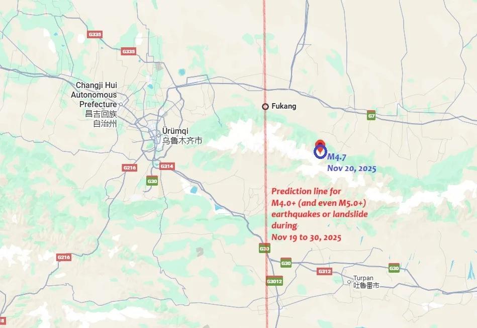 成功预测地震(新疆) 2025年11月20日,新疆北部乌鲁木齐和吐鲁番附近发生4.7级地震。震中位置如图中蓝色圆圈所示,距离红线仅20公里! 红线是我预测线,我已预测2025年11月19日至30日期间,该区域附近将发生4.0级及以上(甚至5.0级及以上)地震或山体滑坡。 所有预测均提前发布在我的网站上,一旦发布,绝不修改或删除。 地震 地震预测 预测成功 新疆 乌鲁木齐