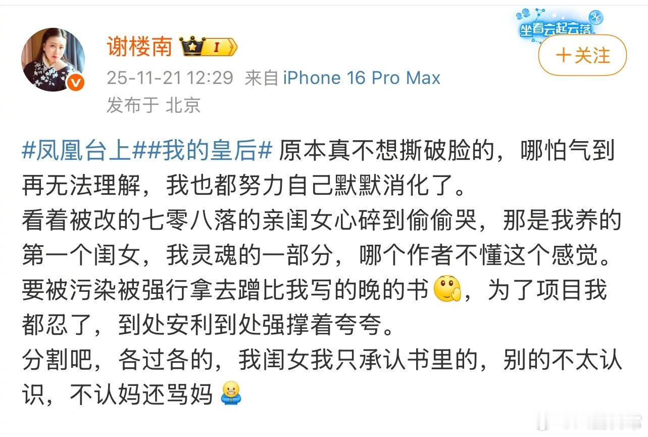 《凤凰台上》原著作者评论发言引发女性观众不满