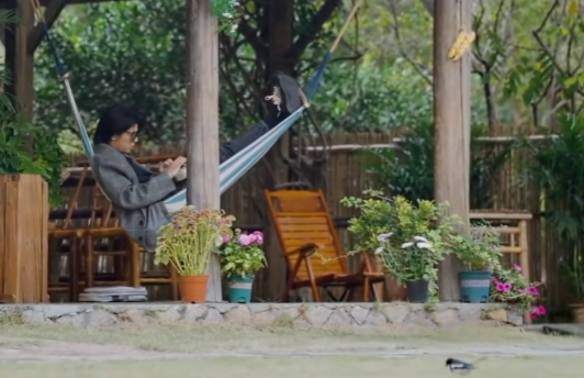 仁科去录制《向往的生活8》,看到室内有人在排练话剧,就找个角落里的吊床,安静地躺