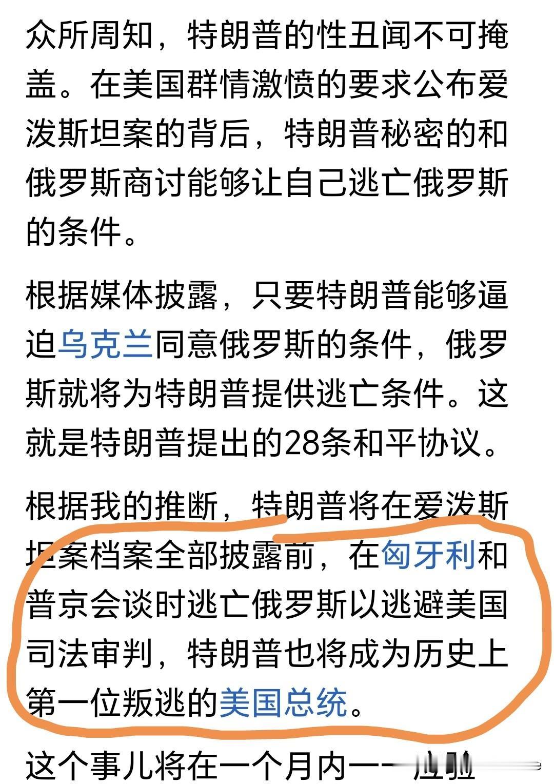 ”特朗普会在匈牙利和普京见面时,以共同乘坐普京车辆的方式,叛逃至俄罗斯。” 这是一位头条博主的预测,让我们拭目以待,看看特朗普是不是美国历史上第一个叛逃的总统。