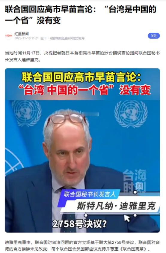 联合国亮出态度! 谁能想到,联合国的三句话,竟能让日本首相高市早苗的台岛言论瞬间冷场。 第一句重申2758号决议的法律效力,第二句强调一个中国原则是国际共识,第三句警告任何挑战决议的行为都是对国际秩序的破坏。这三句话看似平淡,实则像三记重拳,每句都砸在日本政客的软肋上。 日本政府显然没料到联合国反应这么快。要知道,2758号决议通过时日本投了反对票,但后来不得不承认现实。现在高市早苗想翻旧账,联合国直接把历史文件拍桌上,相当于告诉日本:别装失忆,白纸黑字写着呢。日本外务省连夜开会研究对策,最后只敢弱弱回应“尊重联合国立场”,连句硬气话都不敢说。 更尴尬的是,日本国内舆论也炸了锅。共同社发文暗讽高市早苗“外交常识匮乏”,在野党抓住机会要求首相道歉。东京大学教授山口二郎直言:“日本政客总想拿台海问题刷存在感,但忘了自己当年在联合国投票失败的教训。” 联合国这次态度强硬不是没原因的。近年来美国在台海搞小动作,日本跟着起哄,但2758号决议就像个紧箍咒,谁碰谁头疼。决议明确写着“中华人民共和国政府是代表全中国的唯一合法政府”,这条款连美国都不敢公开否认,日本更没胆量挑战。 高市早苗可能以为打“台湾牌”能捞政治资本,结果搬起石头砸自己的脚。日本自民党内部人士透露,首相官邸现在急得像热锅上的蚂蚁,生怕中国反制影响经济。毕竟中国是日本最大贸易伙伴,真闹翻了,日本汽车、电子产业得哭晕在厕所。 联合国这次发声也给其他想碰红线国家提了个醒。国际关系不是过家家,2758号决议通过五十多年,181个国家跟中国建交,这就是现实。日本政客再怎么嘴硬,也改变不了“一个中国”原则写进国际法的事实。 有意思的是,台湾当局原本对高市早苗的言论兴奋不已,结果联合国三句话就把他们打回原形。台外事部门赶紧改口称“尊重联合国决议”,前后态度转变比翻书还快。这下可把绿营支持者气坏了,痛骂蔡英文当局“软弱无能”。 其实日本政客心里清楚,台海问题碰不得。去年日本防卫省内部报告就承认,若台海爆发冲突,日本经济将遭受毁灭性打击。现在高市早苗为选票乱说话,结果被联合国当场打脸,真是自讨没趣。 联合国这次用三句话平息风波,看似简单,实则展现了国际社会对一个中国原则的坚定维护。日本想挑战2758号决议,就像螳臂当车,注定失败。高市早苗的冷场,不过是国际政治现实给日本政客上的一堂必修课。
