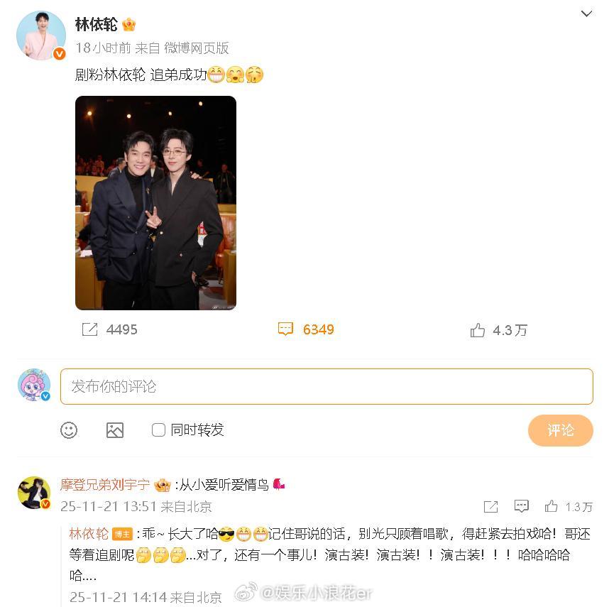 林依轮晒与刘宇宁合照:“剧粉林依轮 追弟成功”刘宇宁互动:“从小爱听爱情鸟🐦”然后林依轮就催刘宇宁去拍戏了,原来还是个事业粉!!!