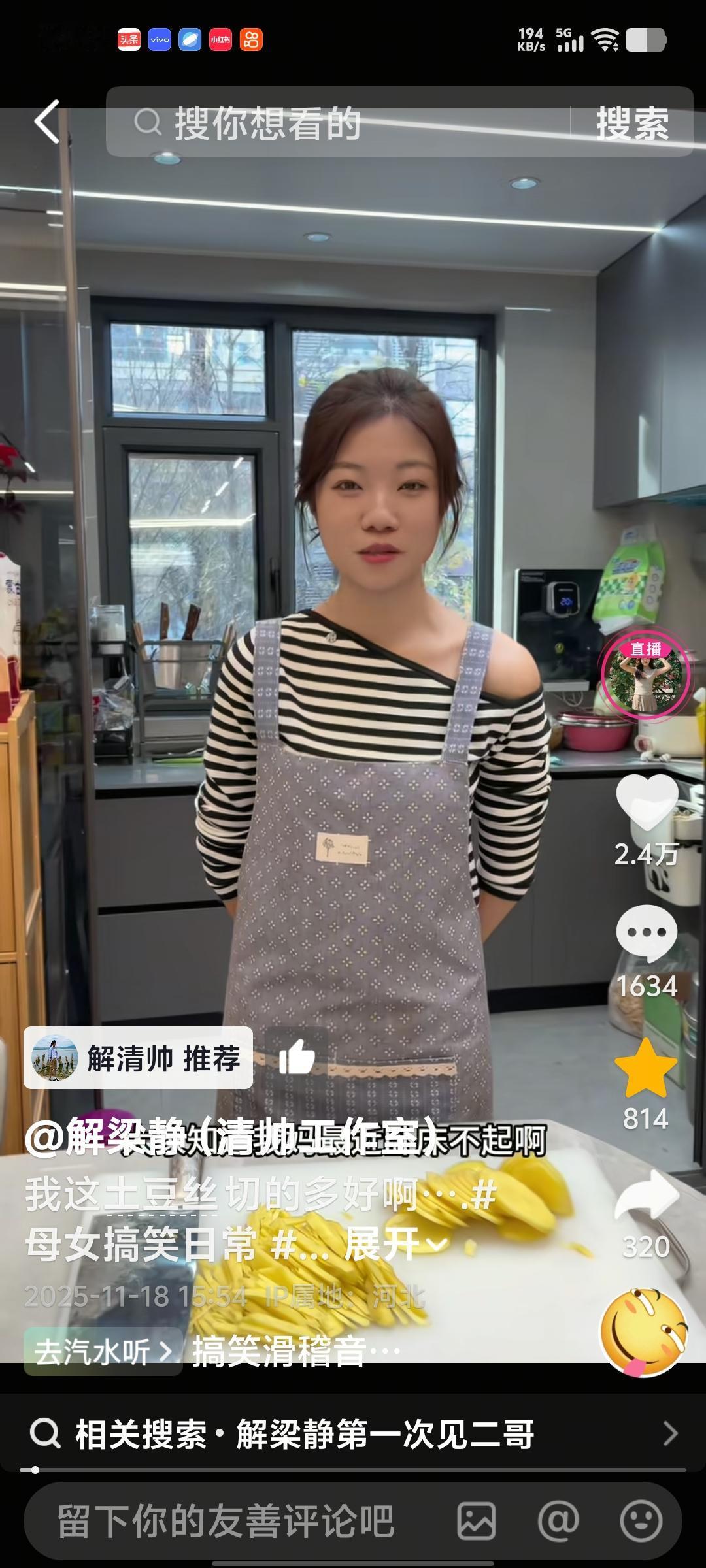 解清帅携家人合体直播!梁静吃播炫大碗面条+学舞进步绝,正正穿搭被追要链接,纯聊天太幸福~ 解清帅今天用梁静的账号直播。正正和梁静三个人一起直播。帅的帅的号用来接整场对应的直播。 梁静的账号用来播一些日常,给大家带一些零碎的东西,直播间很快就来了七八千人。 正正和梁静打扮的可美了,直接干起了吃播,梁静来了一大碗面条。 聊一些日常,大家还挺开心的。梁静这段时间在学跳舞,进步可大了。身段苗条,舞姿优美。 看到他和妈妈牌的一些日常真的很搞笑,冯晓芸腿还没有好,还在坐轮椅。 帮妈妈做饭做菜。结果做起来的切菜速度却没有。妈妈的手快。真的是太有意思了。 直播的时候,一大家子人在一起,嘻嘻哈哈。真幸福,网友们都相中了正正和梁静身上的衣服, 还有发卡,都要链接。帅帅说今天不卖货,只聊天。