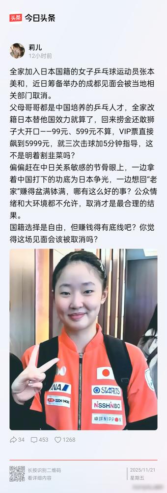 全家移民日本的乒乓球运动员张本智和成都见面会被取消,原本想在中国大捞一把,却赶上了这个节骨眼!取消是对的,合规合理,消除不良影响,教育更多人,做人要有爱国情怀,中国人一定要做到,情系中国的重要性,知道感恩的人才是真正的中国人。 这事儿一出来,网上都炸锅了。成都高新区教育体育局一纸通知,原定12月8号那场高价见面会直接凉凉。俱乐部之前挂出来的售票信息删得干干净净,动作快得让人拍手称快。这种结果,简直是众望所归。 看看那票价设置,简直是把球迷当韭菜割。99块、599块也就算了,那个5999块的VIP票简直离谱,就为了几分钟的击球机会和一顿饭?要知道,咱们国乒的顶尖选手都没敢这么定价。更讽刺的是,同一家俱乐部8月份还给她办过免费见面会,转头就搞起天价售票,吃相实在太难看。 关键节点上,这事儿撞上了敏感时期。日本高层最近在台湾问题上大放厥词,严重伤害中国人民的感情,中日关系骤然紧张。那边日本男团JO1在广州的见面会也因“不可抗力”取消了。在这个大背景下,这种打着亲情牌、实则想从中国市场捞金的商业活动,被叫停一点都不意外。 张本美和的身份太特殊了。父母都是四川人,曾是中国的乒乓球运动员,她却选择加入日本国籍,代表日本队比赛。这种选择是个人的自由,我们尊重。但既然做出了选择,又想利用曾经的“中国背景”回来大把赚钱,这种两头都想占便宜的心态,难免让人心里膈应。国人热情欢迎交流,但绝不接受被当作“钱多人傻”的冤大头。 这次取消,是一次鲜明的警示。它告诉所有人,爱国情怀不是一句空话,它体现在我们每一次的选择和态度里。对于那些一边赚着中国市场的钱,一边可能做出伤害中国人民感情行为的个人或团体,我们必须保持清醒和警惕。市场的欢迎,不等于没有原则和底线。 体育交流本该纯洁美好,一旦被过度的商业算计和不当的政治因素裹挟,就变了味。这次果断取消,维护了咱们的社会情绪,也守住了商业活动的底线。这给所有体育商业运作提了个醒:别总想着割韭菜,真诚和尊重才是长久之计。 接下来,张本美和还要代表日本队参加在成都举行的混合团体世界杯。不知道这场风波,会不会影响她在赛场听到的掌声?但愿所有运动员都能明白,赢得尊重,靠的是球技和品格,而不是精明的商业算计。中国人向来大气,但我们的热情和包容,只给值得的朋友。