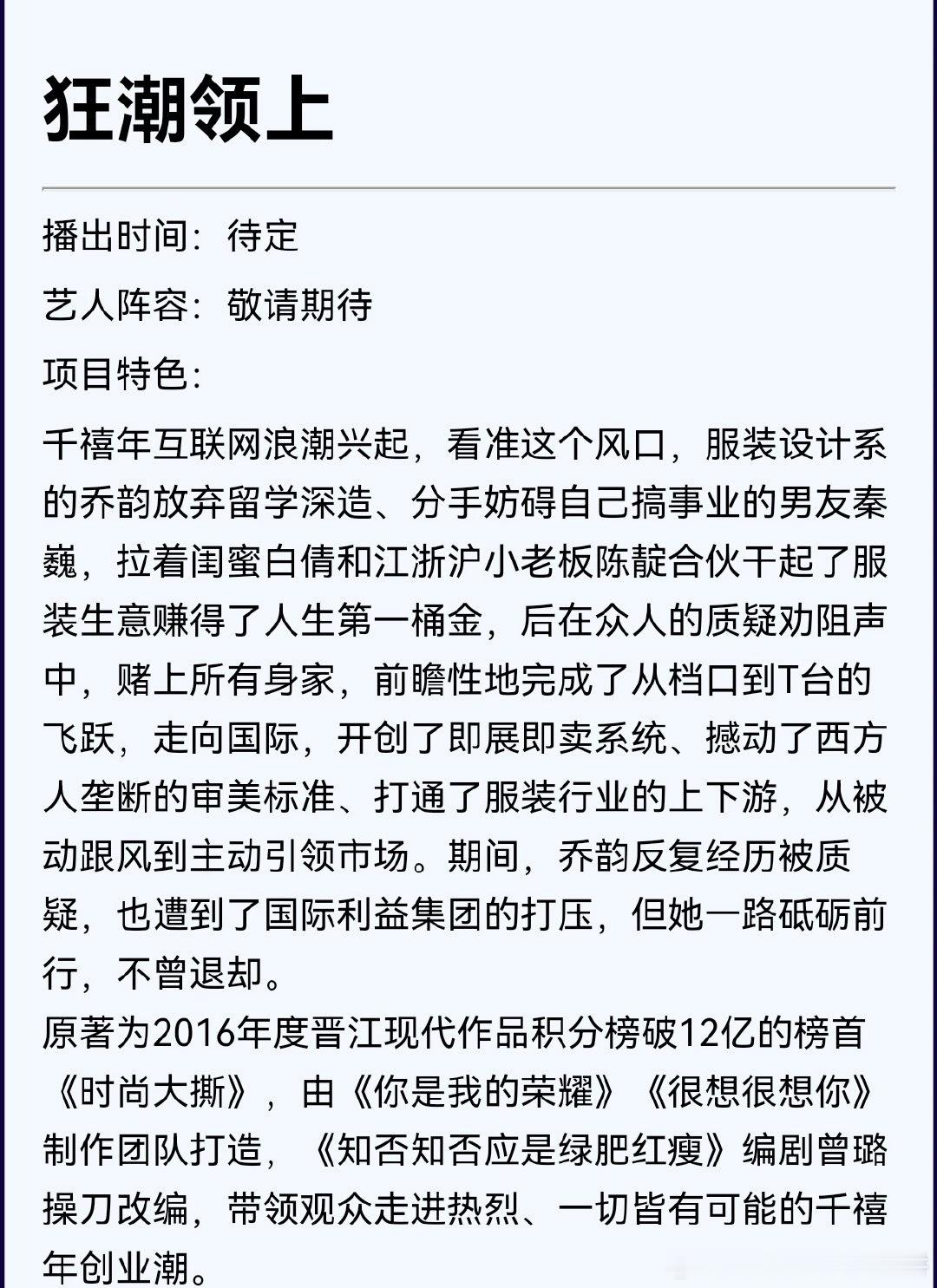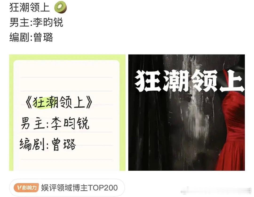 🥝电视剧《狂潮领上》,男主:李昀锐根据御井烹香小说《时尚大撕》改编编剧:曾璐《