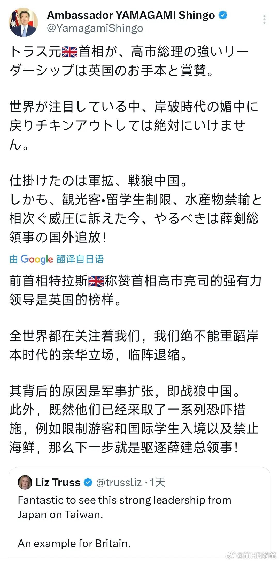 日本还在继续挑事,他们澳洲这个大使代表就是真实的日本态度。这货说,英国前首相特拉斯称赞首相高市早苗的强有力领导是英国的榜样。全世界都在关注着我们,我们绝不能重蹈岸本时代的亲华立场,临阵退缩。其背后的原因是军事扩张,即战狼中国。此外,既然他们已经采取了一系列恐吓措施,例如限制游客和国际学生入境以及禁止海鲜,那么下一步就是驱逐薛建总领事!