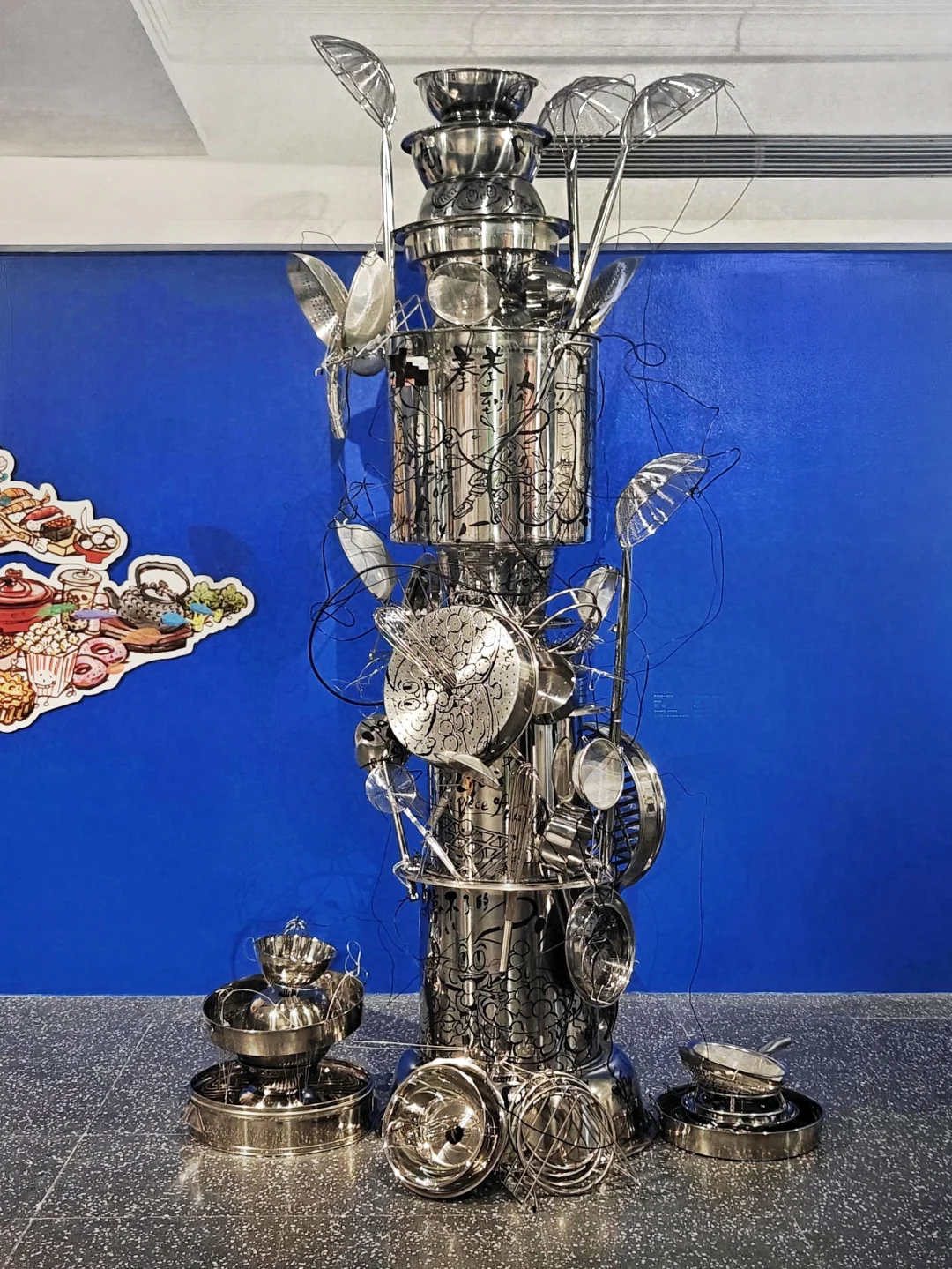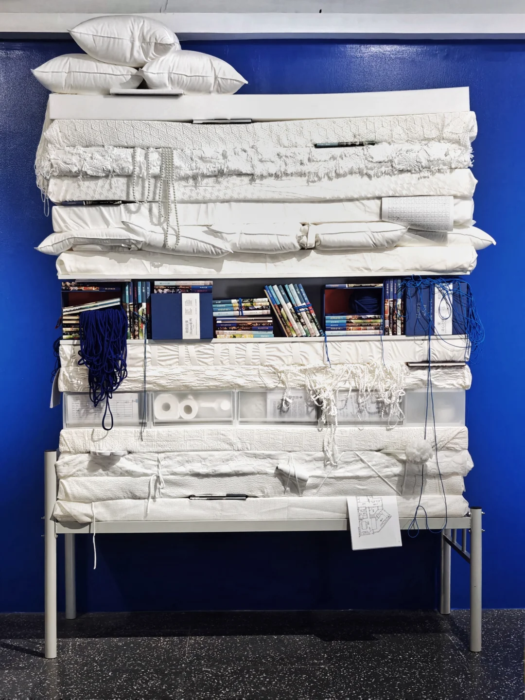 🍳日常美学系列包括:《天天厨房》系列,玻璃钢雕塑+瓦楞纸绘画,构建童趣饮食宇宙;装置《家是心之所安》用床褥、书籍堆砌“家”的意象