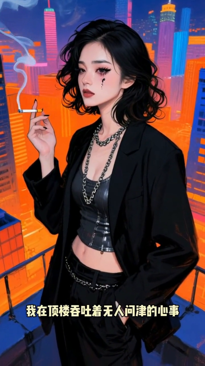 城市把霓虹调成暧昧色,我在顶楼吞吐着无人问津的心事,酒杯里晃着旧时光,每一口都是带刺的甜。雨把回忆泡成碎片,我踩着水洼,一半清醒一半沉沦。烟燃到尽头,就像那些回不去的从前,把他的影子叠进风衣褶皱,从此红是新生不是伤口。