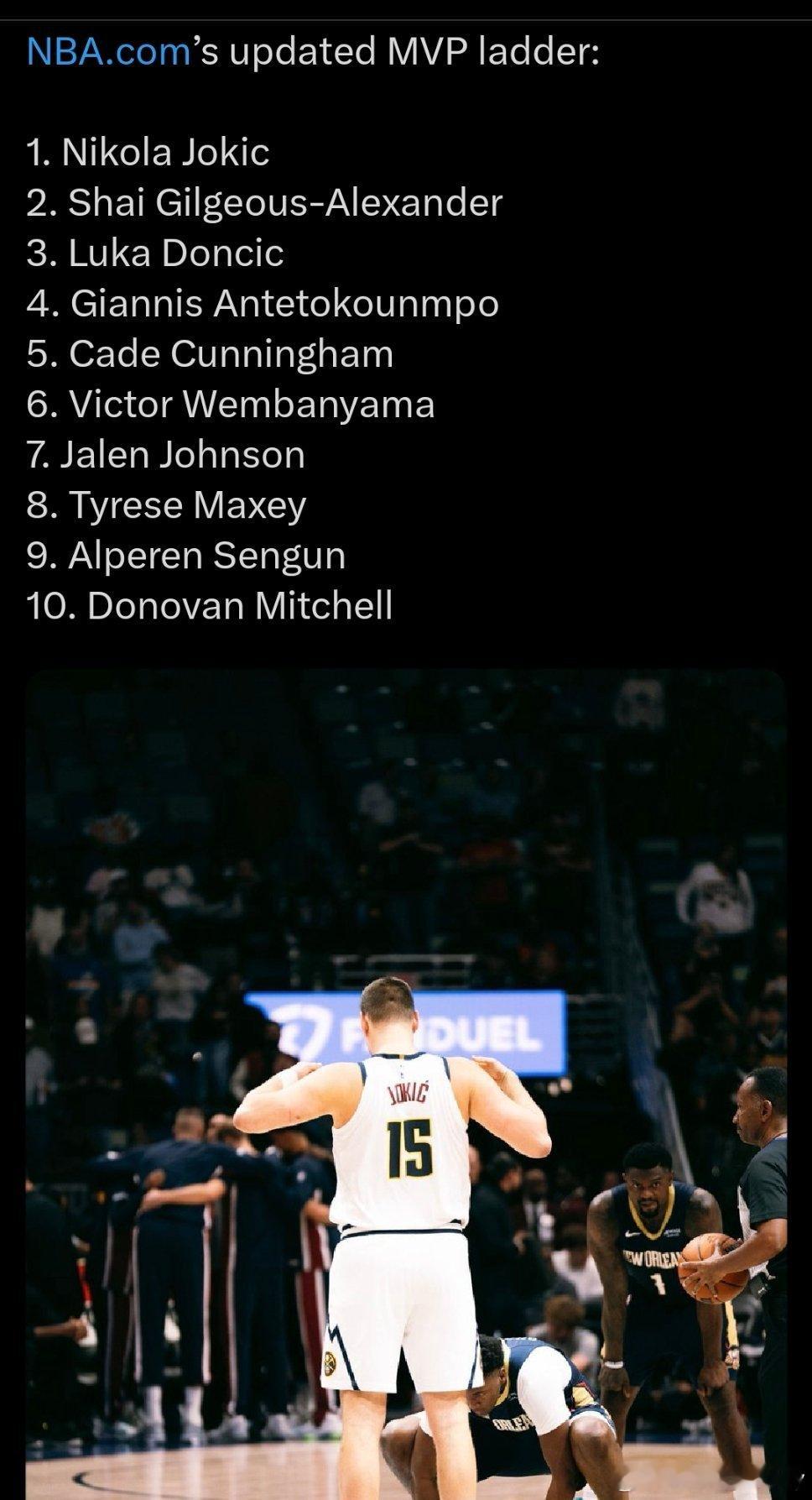 NBA官方最新一期MVP排行榜:约基奇排名榜首,库里获提名。1. 尼古拉·约基奇2. 谢伊·亚历山大3. 卢卡·东契奇4. 扬尼斯·阿德托昆博5. 凯德·坎宁安6. 维克托·文班亚马7. 杰伦·约翰逊8. 泰瑞斯·马克西9. 阿尔佩伦·申京10. 多诺万·米切尔提名:库里、杜伦、鲍威尔、兰德尔、里夫斯