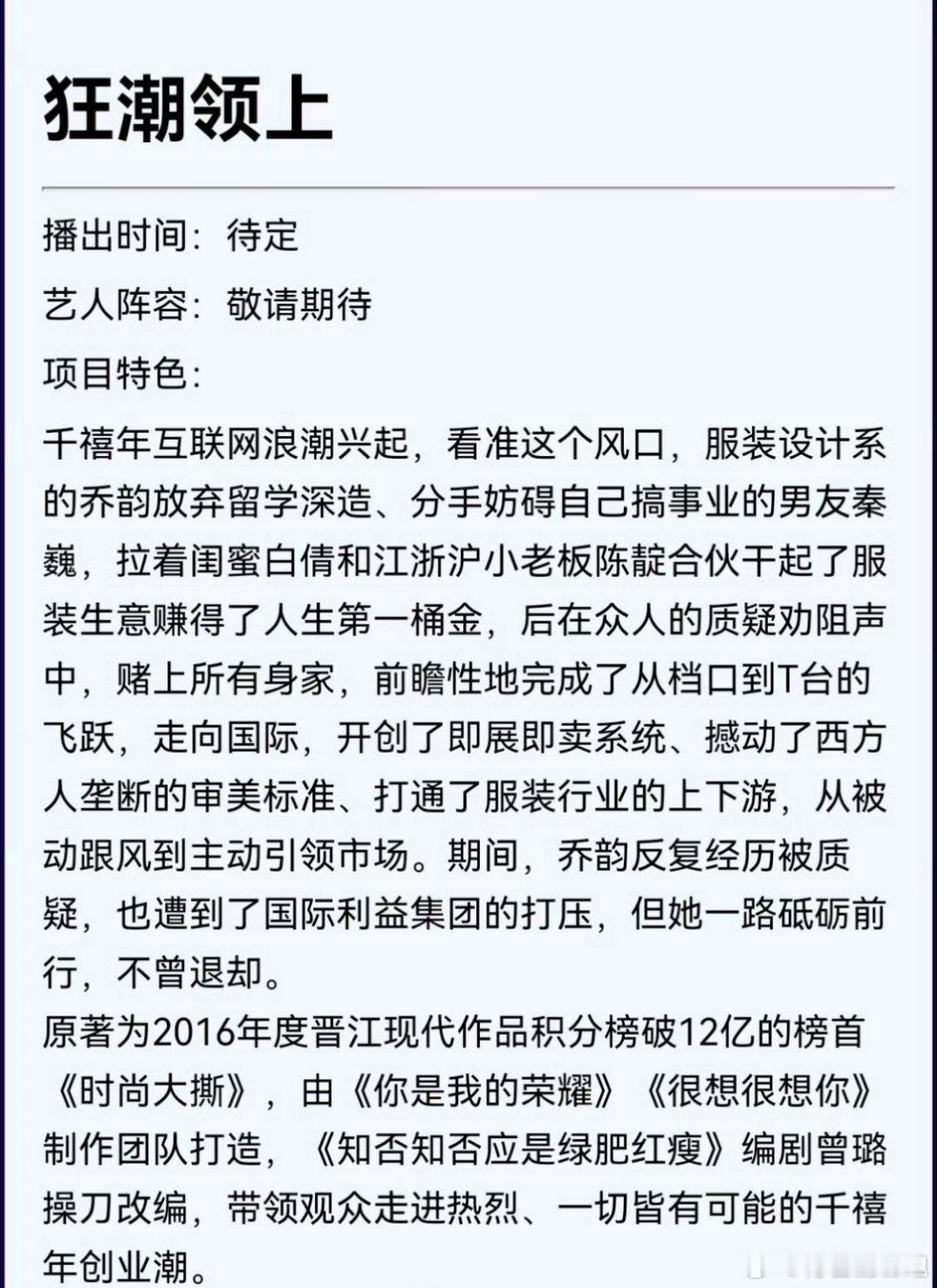网传李昀锐尚公主后要进组《狂潮领上》根据御井烹香小说《时尚大撕》改编看起来这个题材也挺不错的,期待期待!🎉🎉