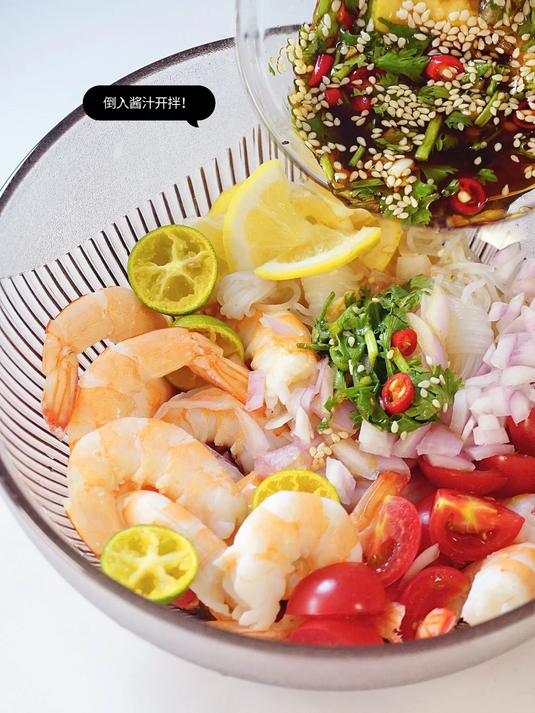 ▫️大碗中放入虾肉、柠檬片、小番茄、洋葱碎、小青柠