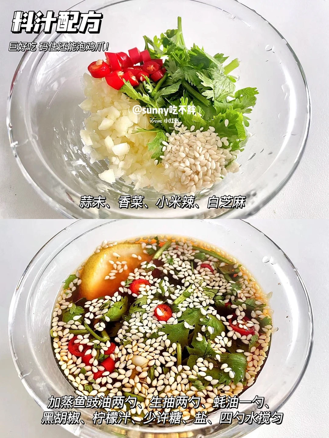 ▫️灵魂酱汁:蒜末、香菜碎、小米辣、白芝麻,加入蒸鱼豉油两勺(代替鱼露,也不影响它的好吃)生抽两勺、耗油一勺、黑胡椒、柠檬挤汁、少许糖、盐、四勺水搅匀