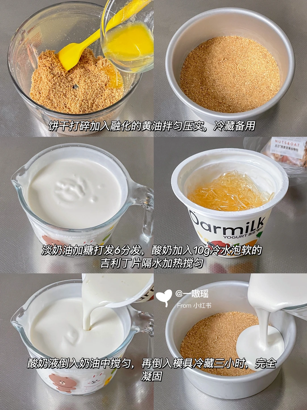冰冰凉凉、奶香浓郁的酸奶慕斯,搅一搅就能做,无需烤箱很方便 入口即化的夏日清爽小甜品🍃 简单快手不翻车,挖一勺🥄多种口感体验😋 ~ 🛒食材 消化饼干(或威化饼干)70g 黄油30g 淡奶油180g 酸奶120g 吉利丁片20g 糖25g QQ糖70g 无籽青提(阳光玫瑰)适量 雪碧220g • 👩🏻‍🍳做法 ▫️饼干绞肉机打碎(或擀面杖碾碎)加入融化的黄油拌匀压实,冷藏备用 ▫️淡奶油加糖打发6分发 ▫️酸奶加入10g冷水泡软的吉利丁片隔水加热,搅匀 ▫️倒入奶油中搅匀 ▫️倒入模具冷藏至凝固 ▫️QQ糖加30g饮用水隔水加热融化 ▫️放凉后倒入模具冷藏 ▫️QQ糖层半凝固状态,放入青提 ▫️50g雪碧隔热水加热,放入泡软的吉利丁片搅匀 ▫️再和剩下雪碧混合倒入模具冷藏4小时 - 🔖 慕斯蛋糕用到吾岛希腊酸奶(见页面底部🔗),质地很浓厚,挂勺不掉,自带格兰诺拉燕麦,每一口都香香脆脆 🆕蜜桃味&菠萝味,纯纯水果果酱添加,果味特正!冷藏后的冰淇淋口感爱惨了😭!🍧 [两颗心R] 🔴Tips ·电吹风热风或者热毛巾敷一下模具,轻松脱模 ·提子用没有籽的 切块和吃起来都更方便,建议阳光玫瑰,纯甜不酸口感更佳