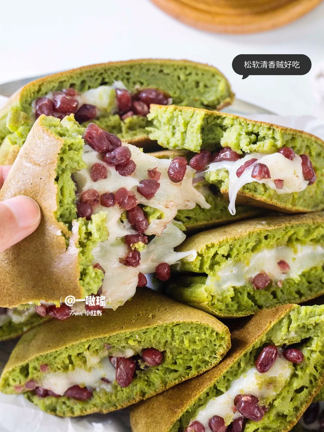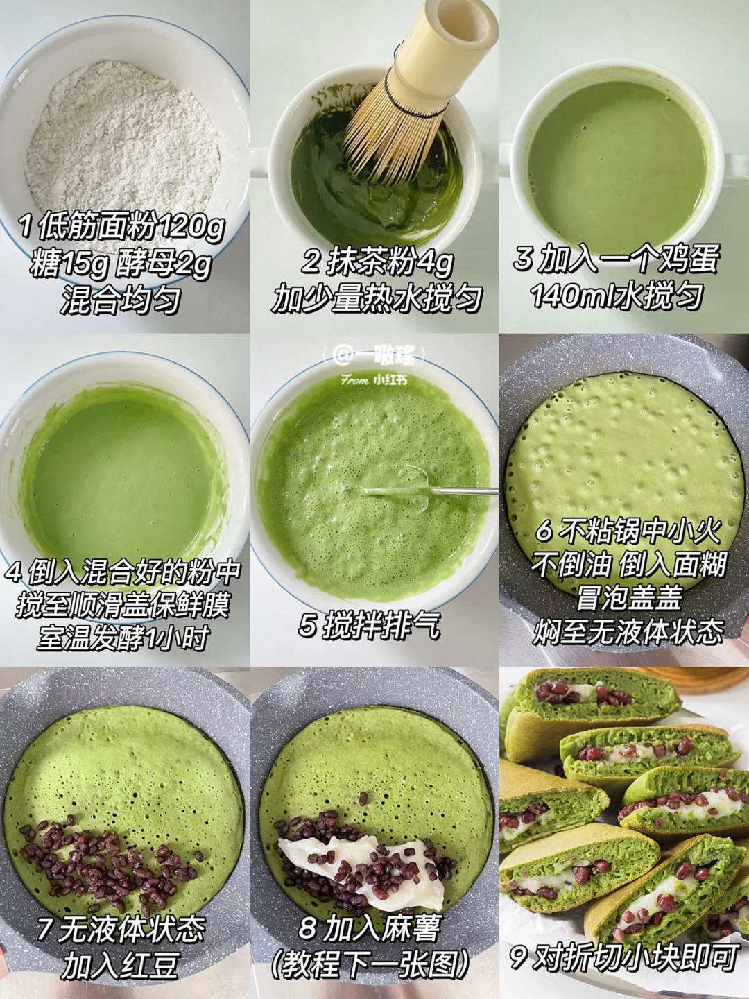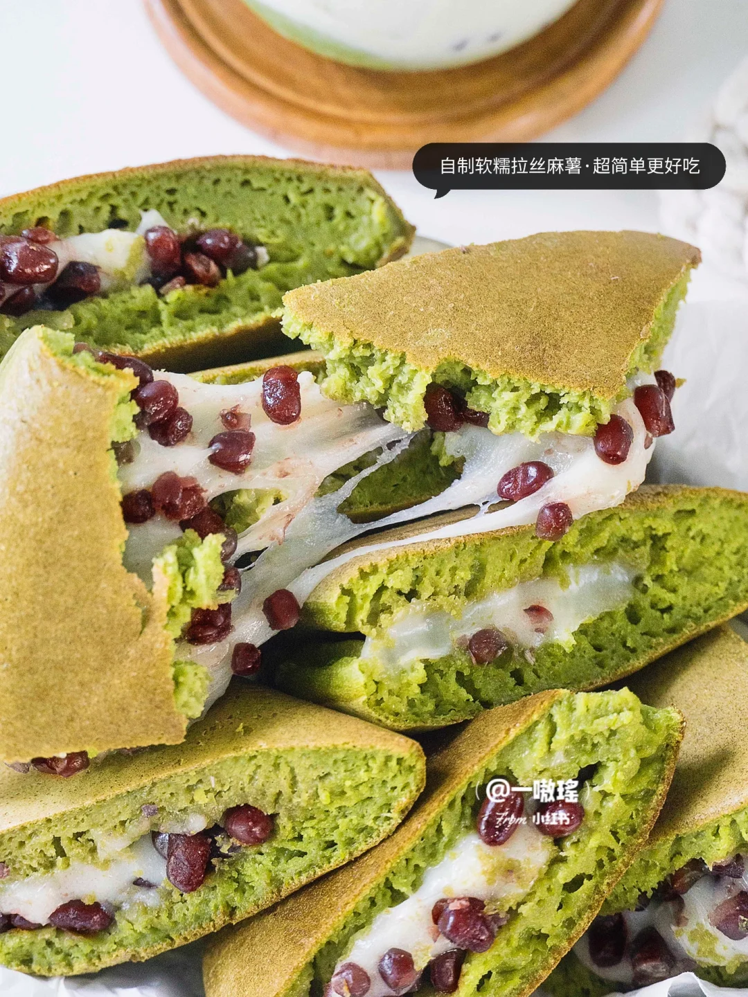 我的宅家美食日记 笔记灵感 所有食材搅一搅🥢 平底锅煎一煎🍳 轻松搞定蓬松绵软的抹茶厚松饼🥞 ✨低糖0油版✨ 更清新更低卡,甜度适中不会腻 加上软糯拉丝的麻薯,口感层次更丰富了! - 食材🔖 ♡ 抹茶厚松饼:低筋面粉120g 酵母粉2g 糖15g 抹茶粉4g 鸡蛋1个 蜜红豆适量(一个松饼的量) ♡ 麻薯:糯米粉50g 玉米淀粉18g 玉米油7g 糖10g 做法见图6、7🔖 -