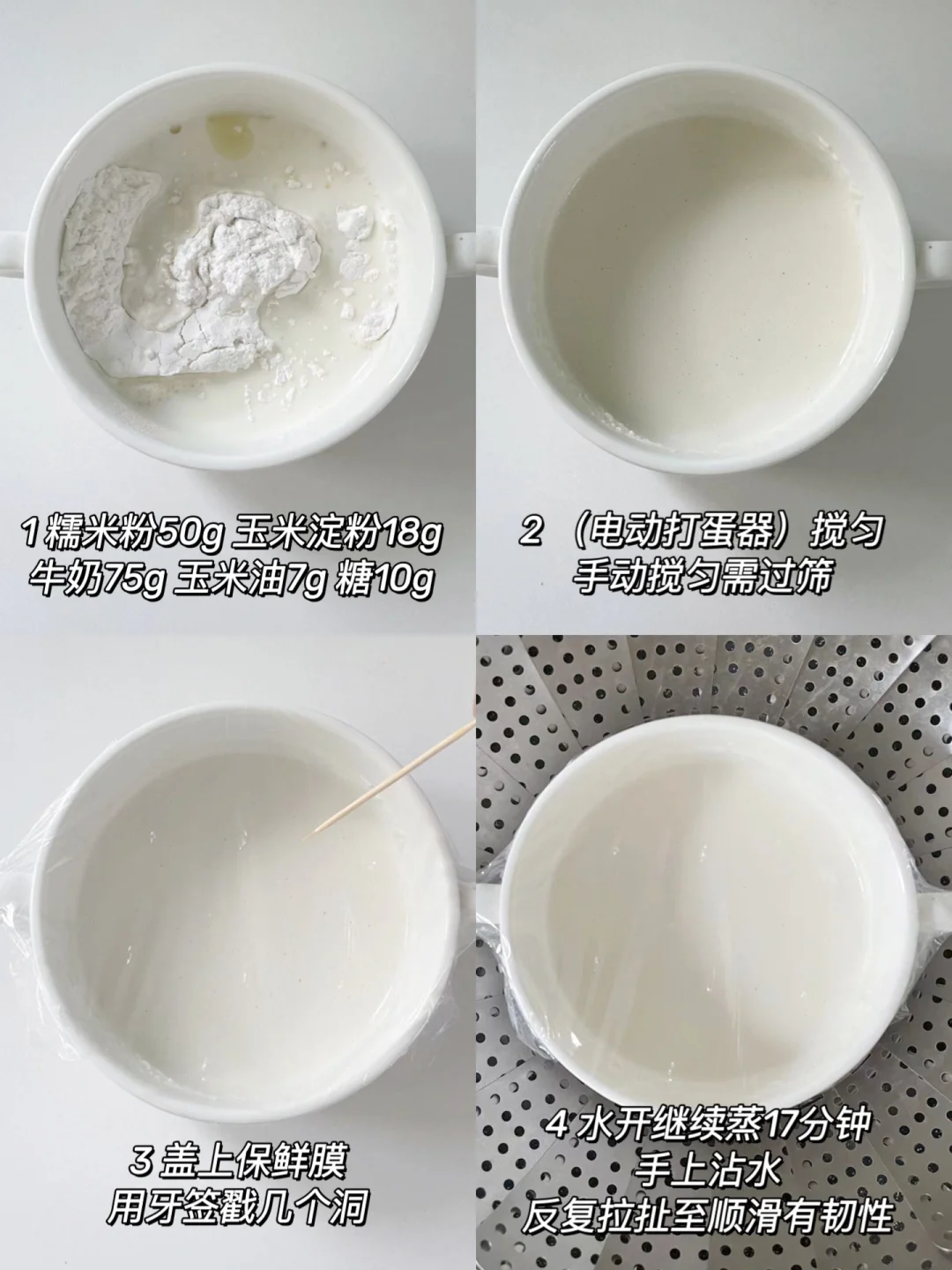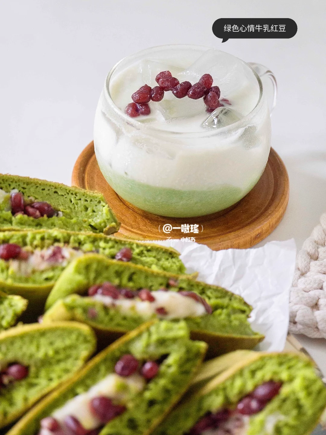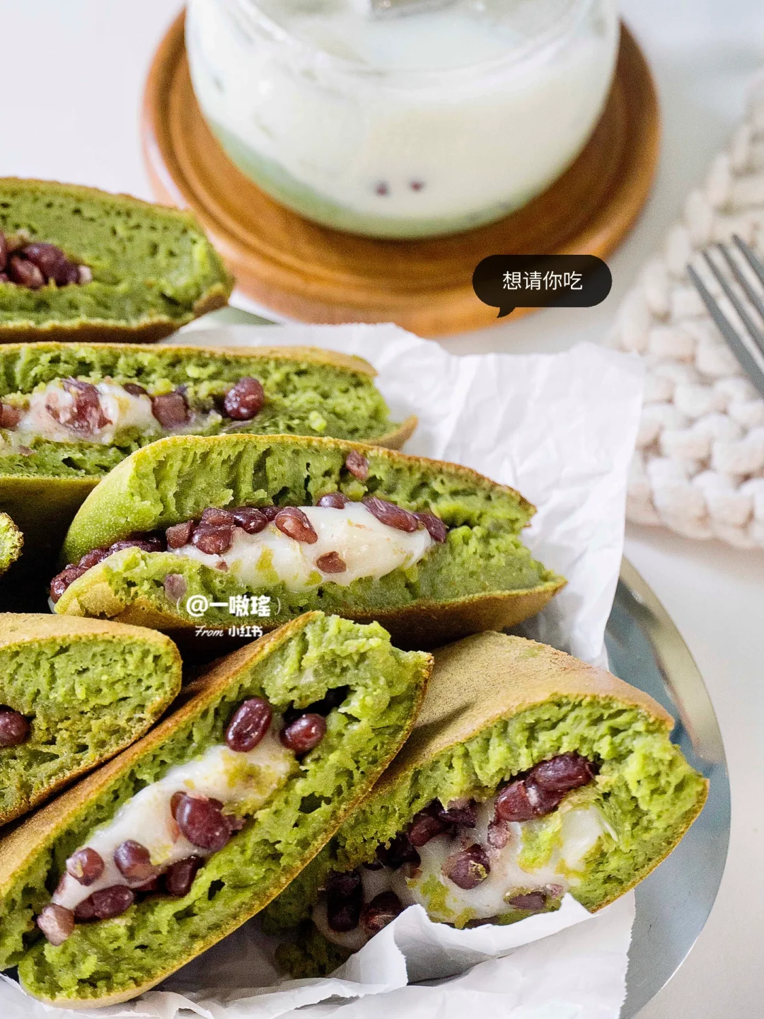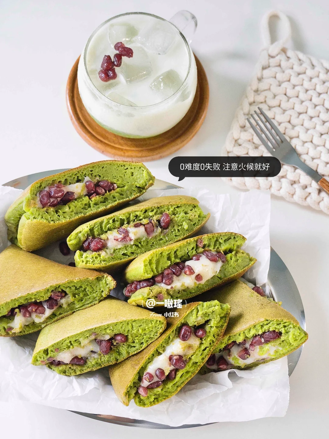 我的宅家美食日记 笔记灵感 所有食材搅一搅🥢 平底锅煎一煎🍳 轻松搞定蓬松绵软的抹茶厚松饼🥞 ✨低糖0油版✨ 更清新更低卡,甜度适中不会腻 加上软糯拉丝的麻薯,口感层次更丰富了! - 食材🔖 ♡ 抹茶厚松饼:低筋面粉120g 酵母粉2g 糖15g 抹茶粉4g 鸡蛋1个 蜜红豆适量(一个松饼的量) ♡ 麻薯:糯米粉50g 玉米淀粉18g 玉米油7g 糖10g 做法见图6、7🔖 -
