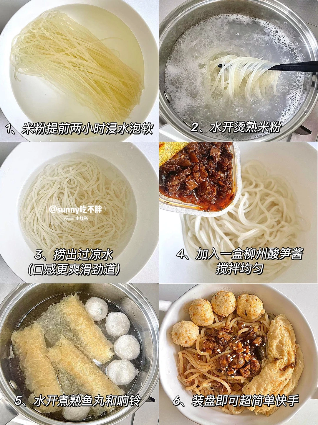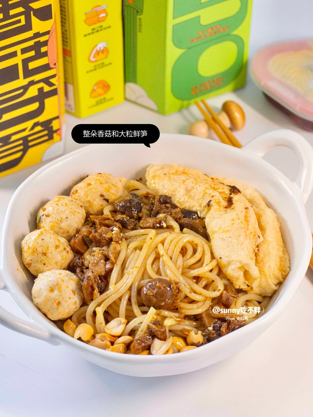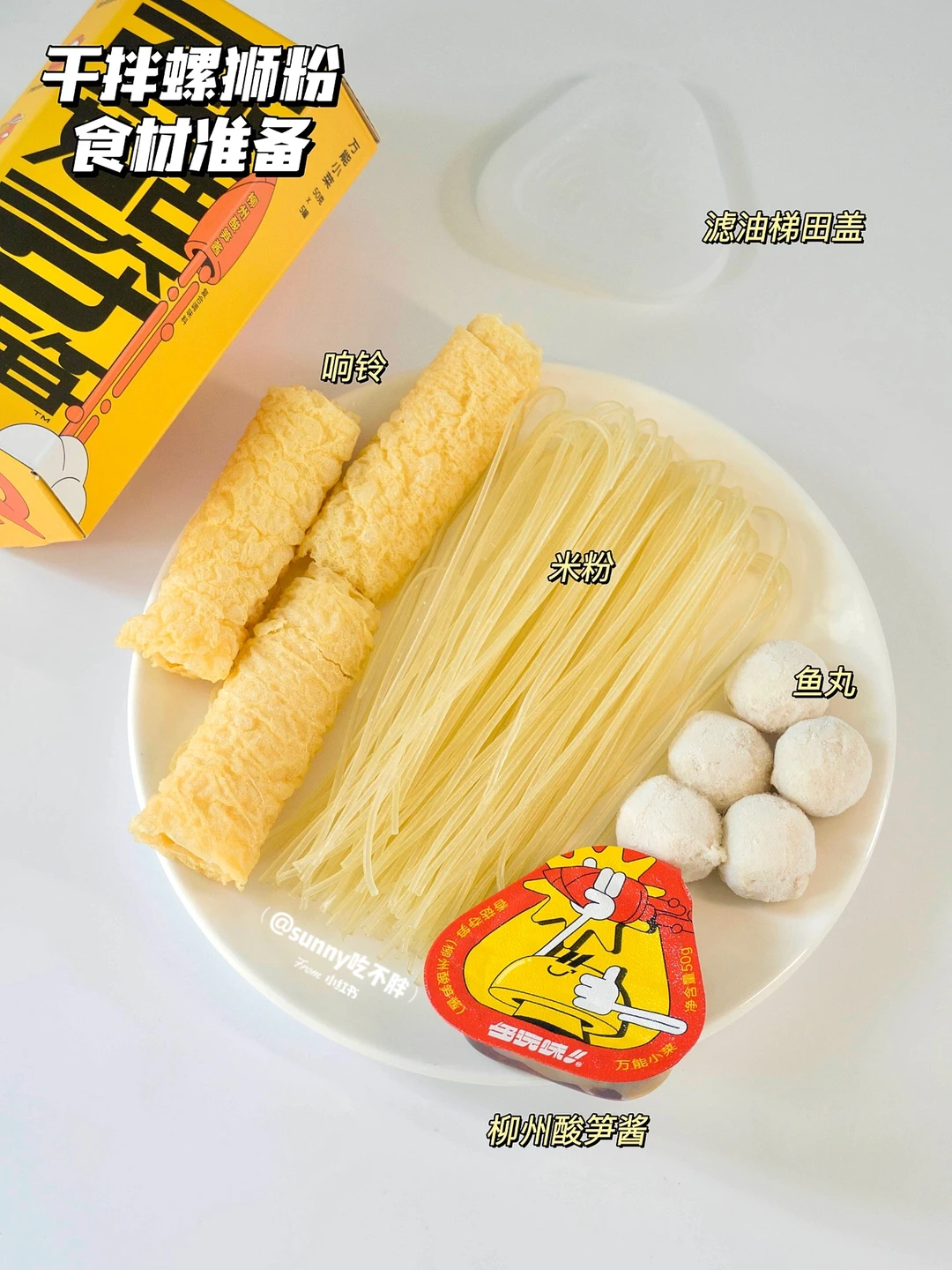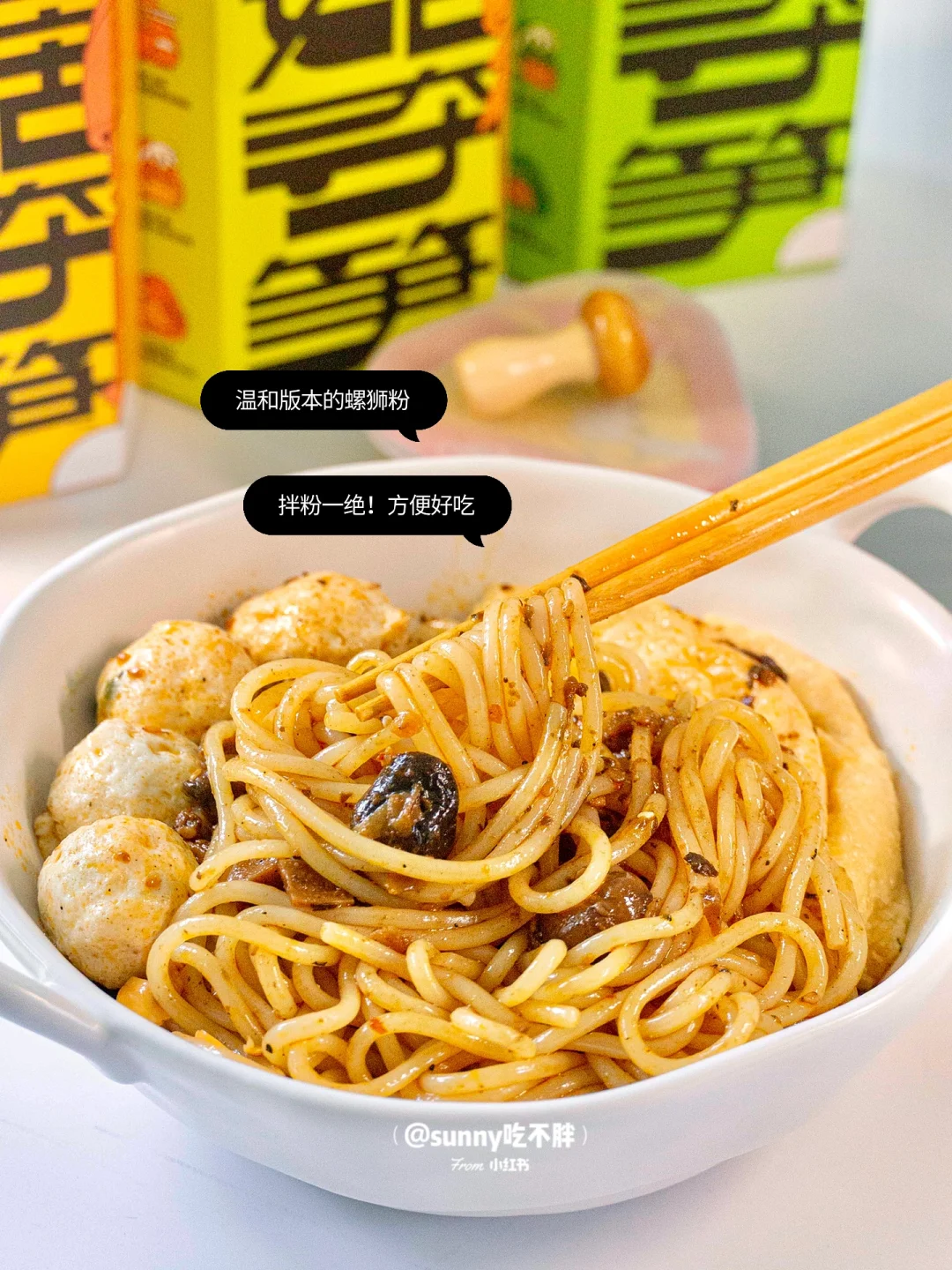 🍜干拌螺狮粉就更省事了,煮熟的米粉拌着一盒多玩味柳州酸笋酱(记得用自带的滤油梯田盖过滤一下多余的油)加上爱吃的配菜,推荐给爱吃螺狮粉和拌米粉的小仙女,口味比螺狮粉温和许多,更多的酸笋和香菇的鲜香。
