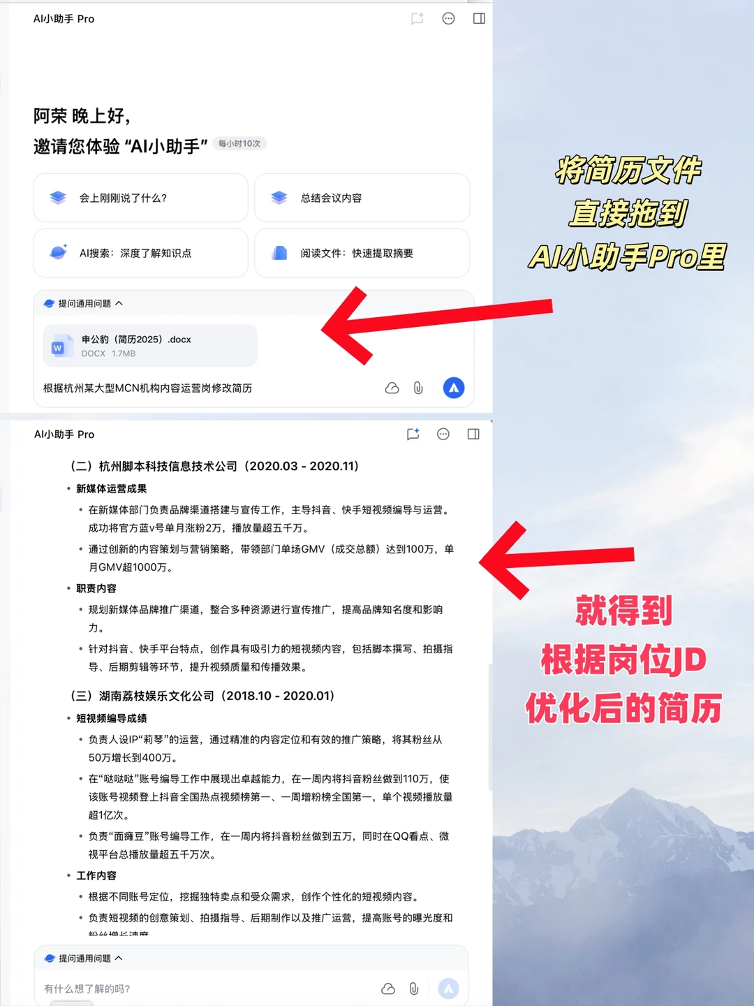 👉比如“根据杭州某大型MCN机构内容运营岗修改简历”,