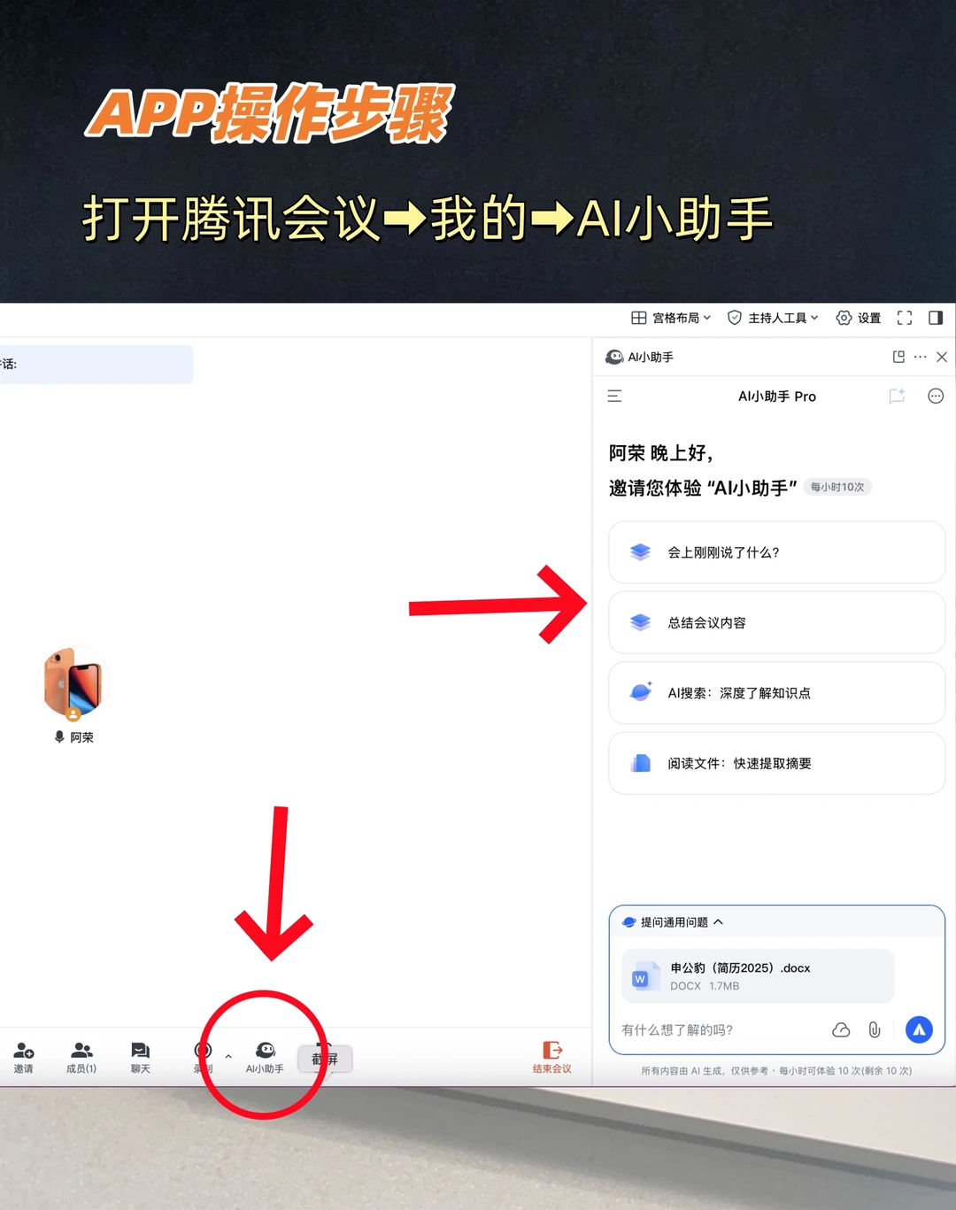 ⚠️ 附:在腾讯会议【我的】点【AI小助手】就能用,也可以在会中工具栏实时唤醒使用!