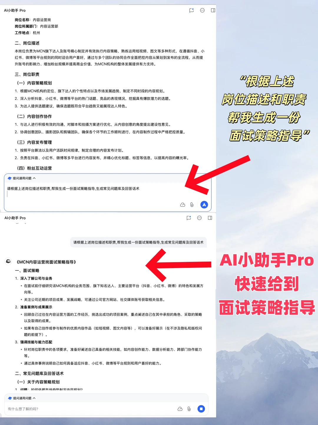 比如我表弟面试的是杭州某MCN机构运营岗,它就给出了详细的问题库和话术。