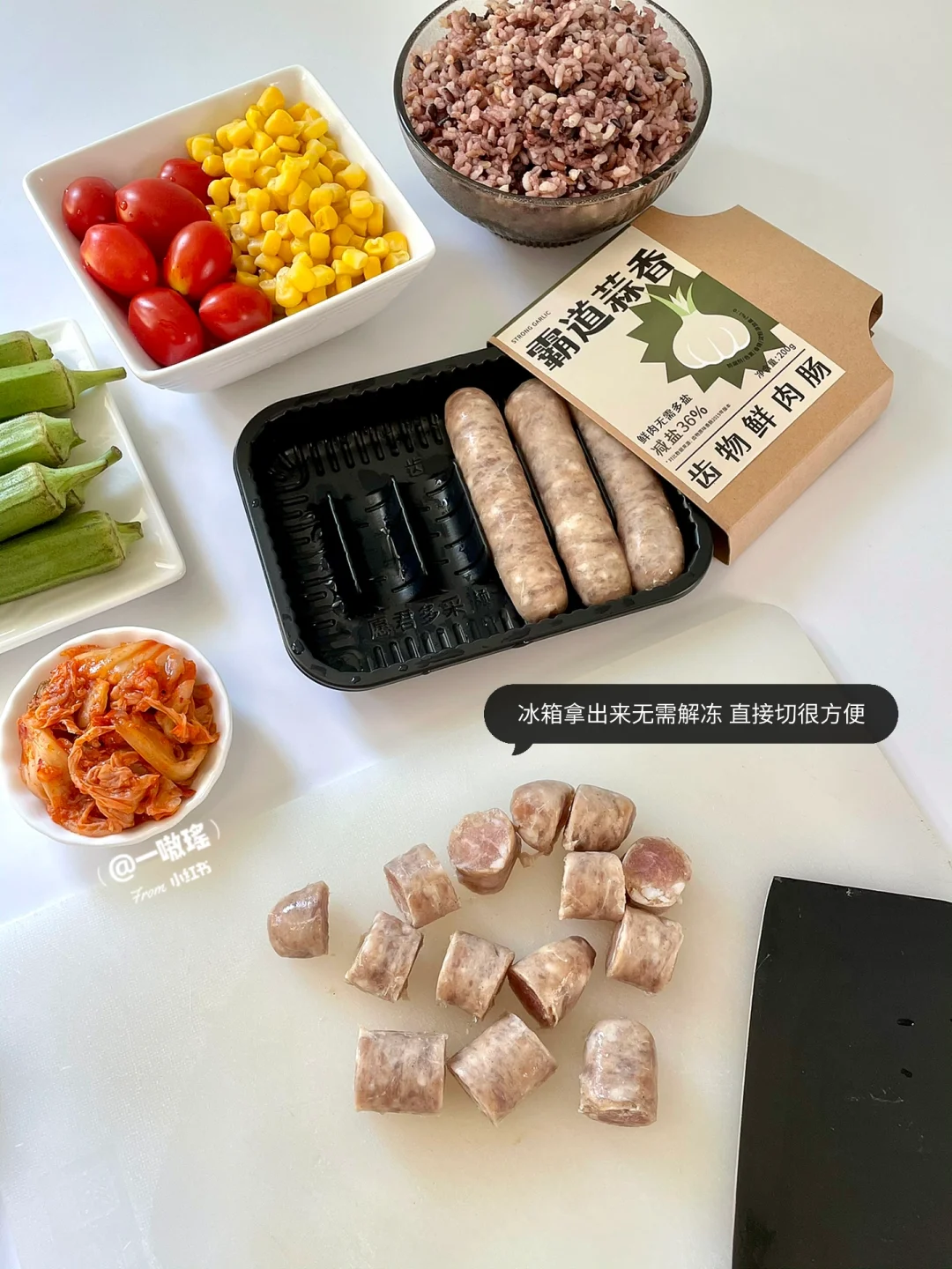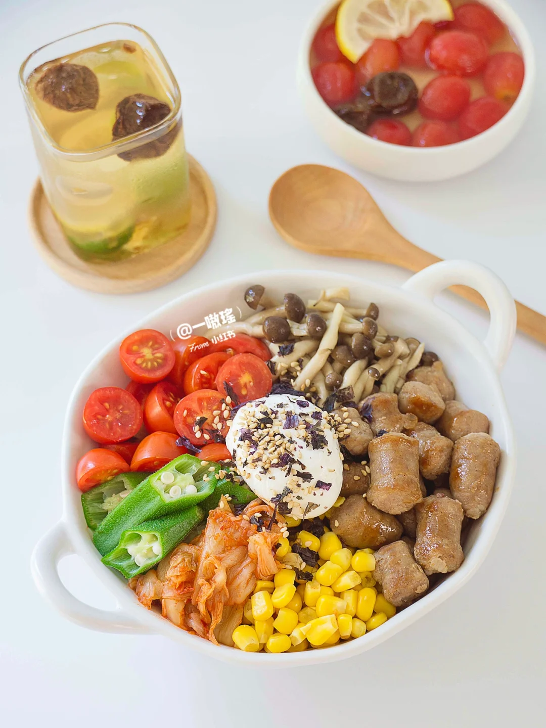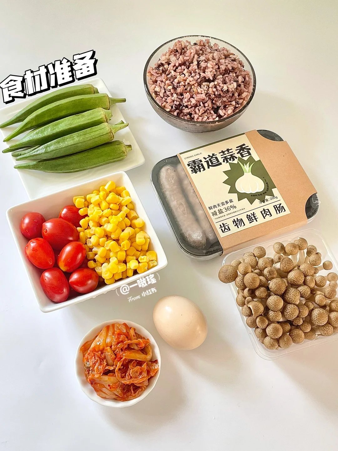 三色糙米 蟹味菇 秋葵 玉米粒 小番茄 齿物鲜肉肠 泡菜 鸡蛋