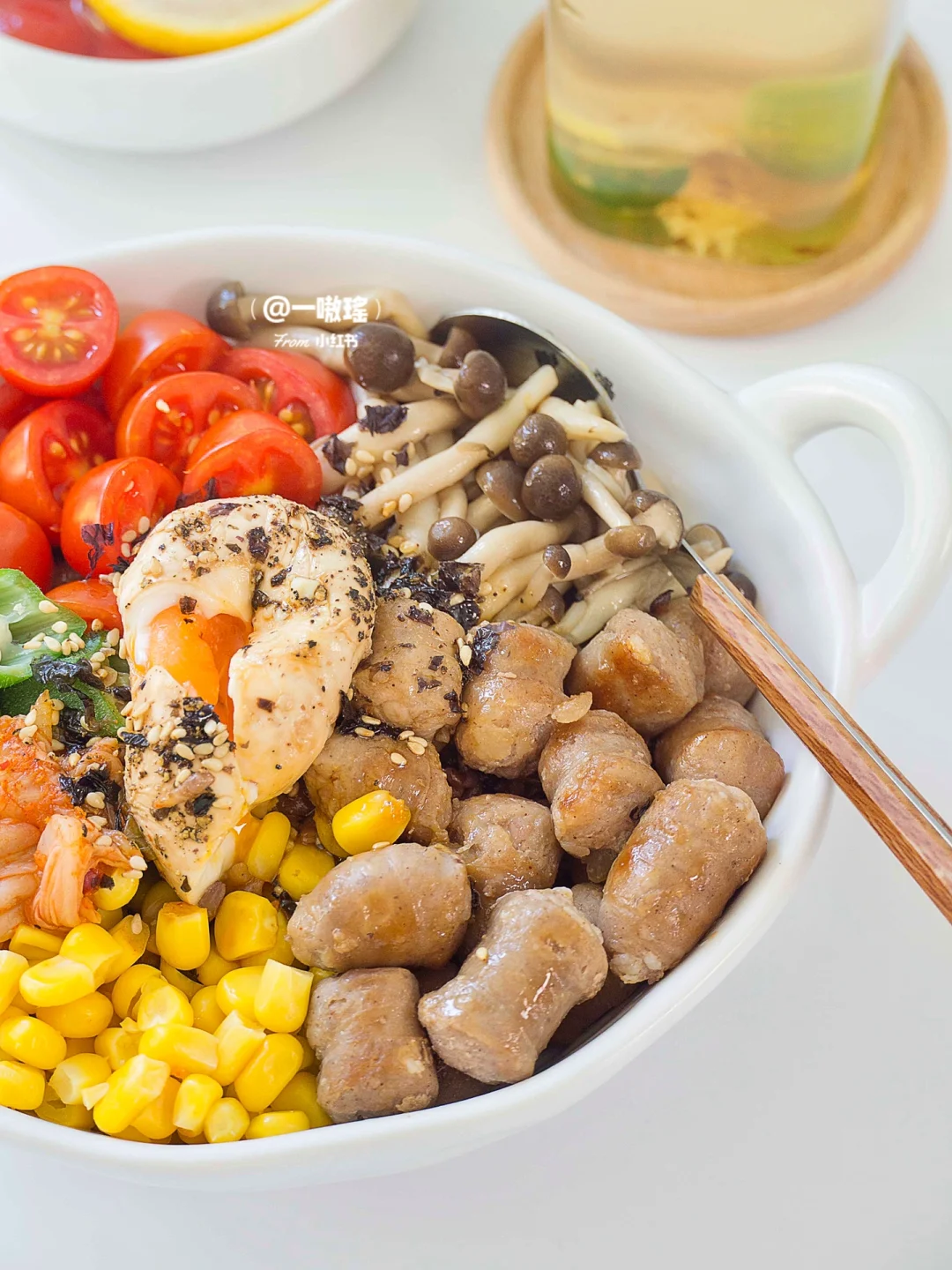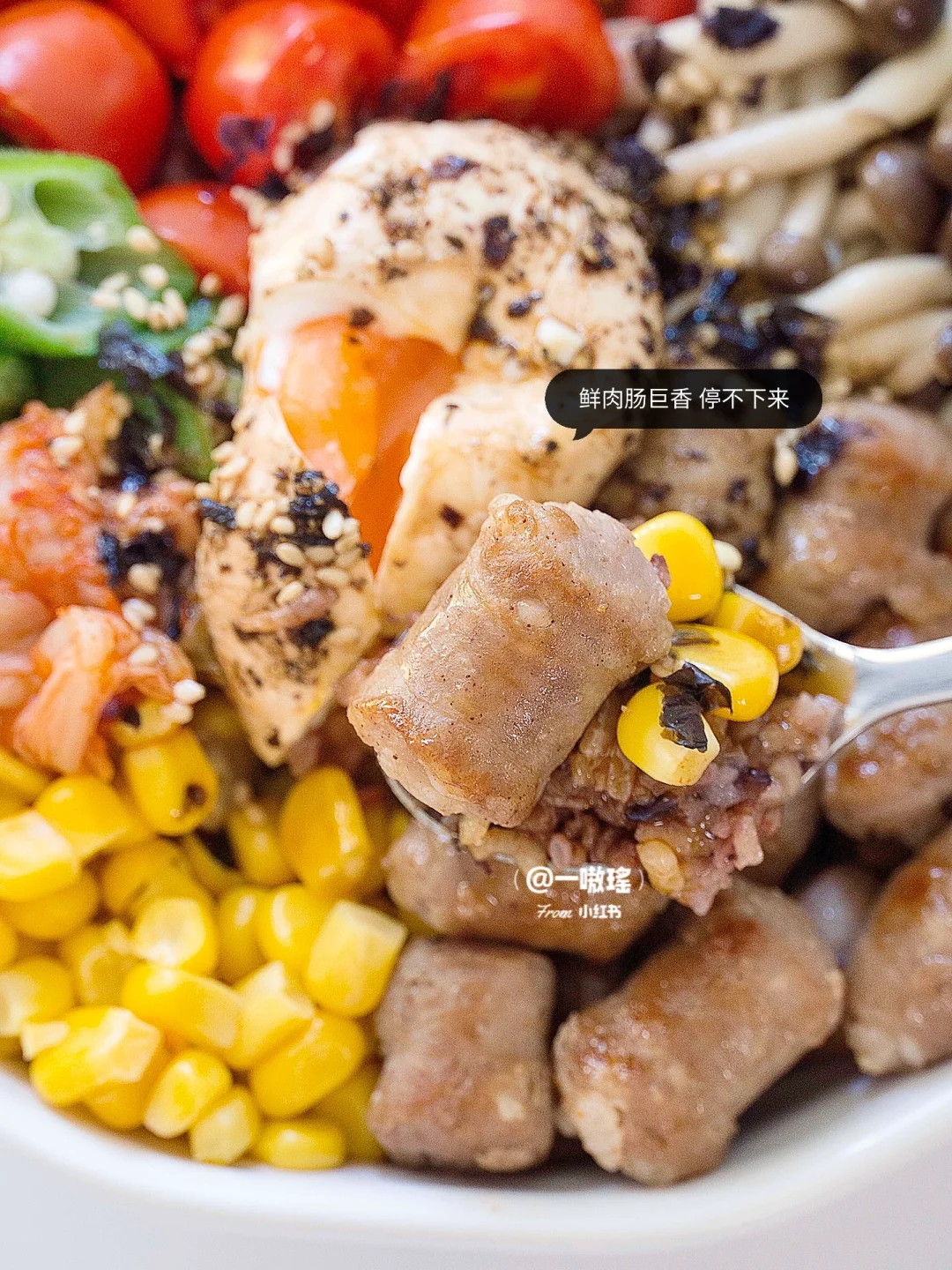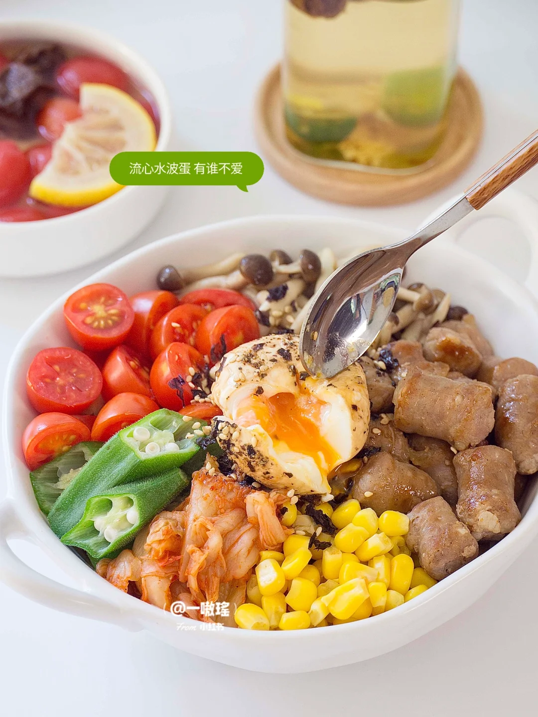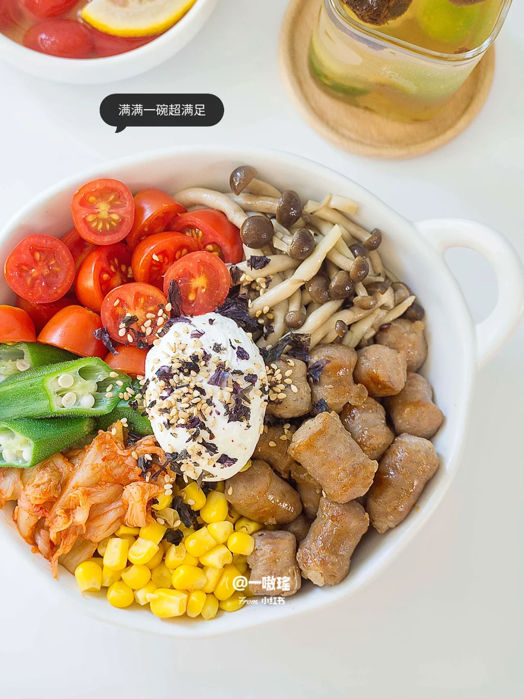 三色糙米 蟹味菇 秋葵 玉米粒 小番茄 齿物鲜肉肠 泡菜 鸡蛋
