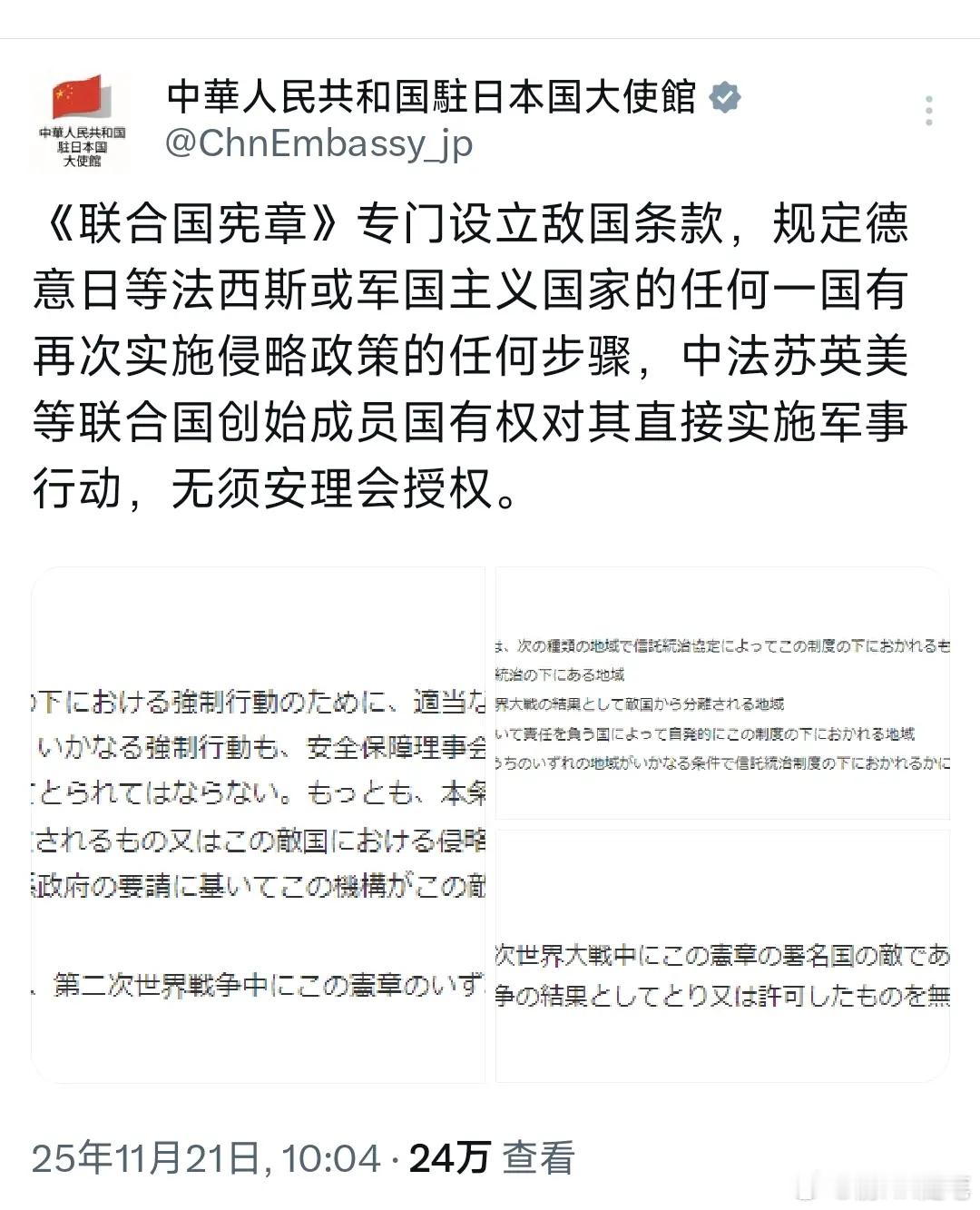 高市早苗死不悔改,中国使馆亮“敌国条款”大招11月21日,日本首相高市早苗在首相官邸的表态堪称掩耳盗铃,一边声称寻求与中国的“战略互惠关系”“建设性稳定关系”毫无变化,一边顽固坚持介入台海的错误言论,拒不撤回公然干涉中国内政的谬论。面对高市早苗一直持续两面三刀的挑衅,中国驻日大使馆援引《联合国宪章》“敌国条款”,规定德意日等法西斯或军国主义国家的任何一国有再次实施侵略政策的任何步骤,中国等联合国创始成员国可直接采取军事行动,无需安理会授权 。这一强硬表态,一方面对高市政权死不悔改的严正警告,另一方面是中国捍卫核心利益的行动法律宣言,提前告知了。高市早苗的顽固立场绝非个人表态,而是关乎国际秩序与地缘安全的关键问题。台海问题是中国核心利益中的核心,是不容任何外部势力触碰的红线。如果放任高市政权拒不撤回介入谬论,就等于默许西方阵营可以随意践踏他国核心利益、破坏国际规则。这不仅会让中国的主权尊严受损,更会导致地区安全秩序崩塌,让西方阵营高人一等。因此,中方必然要求日方作出正式公开承诺,彻底放弃介入台海的危险图谋,这是维护中日关系底线的必然要求,也是对地区和平稳定的基本责任。事实上,日本根本不具备介入台海的实力与底气。高市政权鼓吹“台湾有事即日本有事”,将台海冲突与所谓“存亡危机事态”挂钩,本质上只是依附美国的跟班行径。军事上依赖美军支持,安保上绑定《美日安保条约》,所谓“介入能力”不过是狐假虎威的空谈。日本自卫队个人能力下降、装备老化,弹药储备仅能支撑两周高强度作战,全境无战略纵深,一旦真的卷入冲突,无异于引火烧身。而高市早苗之所以执意炒作涉台议题,不过是为了煽动民粹、拉高支持拙劣伎俩,试图以“抗中”口号掩盖国内民生困境,这种拿国家安危赌政治私利的行为,早已遭到日本国内有识之士的批判,被斥为“日本真正的存亡危机” 。从战略层面看,对日方的挑衅作出强力回应,也是必要的底线测试。近年来,中国在与美国的贸易战、科技战中积累了丰富的博弈经验,清晰摸清了对方的战略底牌与行动边界。如今面对日本的涉台挑衅,正是测试其真实战略意图与行动能力的关键契机。通过明确反制措施与代价,既能让日方清醒认识到介入台海的灾难性后果,也能为未来可能出现的冲突场景积累应对经验,确保在真正的危机来临时,能够做到知己知彼、从容应对。日本若误判形势,将中国的克制视为软弱,执意追随美国搞“以台制华”,终将付出远超预期的代价。高市政权的挑衅背后,也是日本社会对中国认知的严重偏差与军国主义思潮的回潮。作为曾对台湾实施半个世纪殖民统治、犯下滔天罪行的国家,日本在台湾问题上本就负有不可推卸的历史原罪 。然而高市政权不仅毫无反省,反而妄图通过炒作涉台议题推动修宪扩军、修改“无核三原则”,从防御型国家向进攻型国家转变,这种危险动向正在重蹈历史覆辙 。“小国辱大邻,可亡也”的历史规律古今通用,日本若持续被右翼思潮裹挟,放任对中国的认知偏差恶化,执意与邻为敌,最终只会反噬自身。中国驻日使馆援引“敌国条款”的回应,绝非危言耸听,而是相当于一个提前告知宣言了。