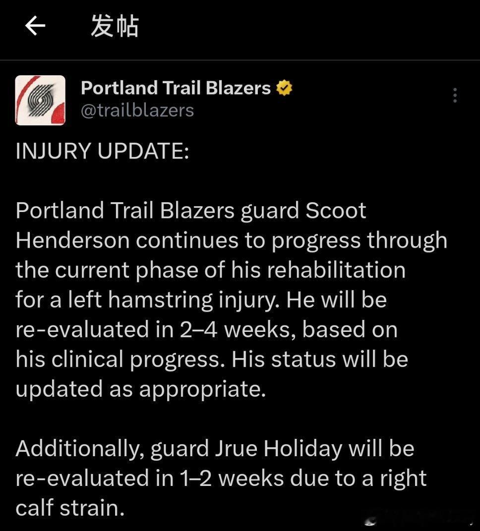 开拓者官方公布伤病报告。斯库特·亨德森左腿筋恢复顺利,将在2-4周后复查。朱·霍勒迪右小腿拉伤,将在1-2周内重新评估。