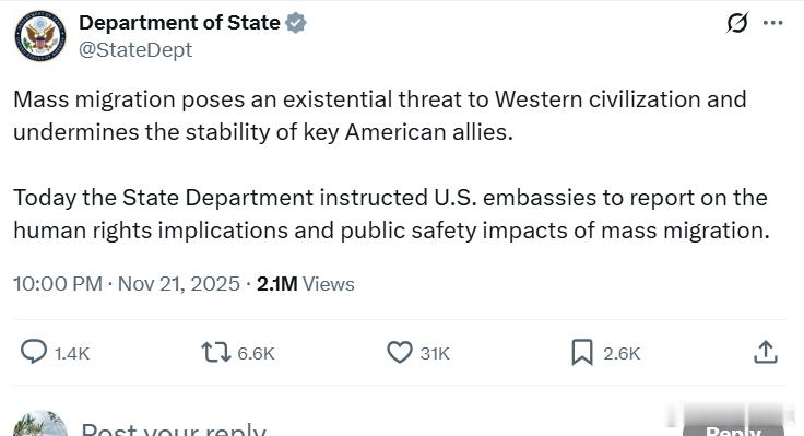 美国国务院:大规模移民对西方文明构成生存威胁,并破坏美国重要盟友的稳定。今天,国务院指示美国各大使馆报告大规模移民的人权影响及对公共安全的影响。