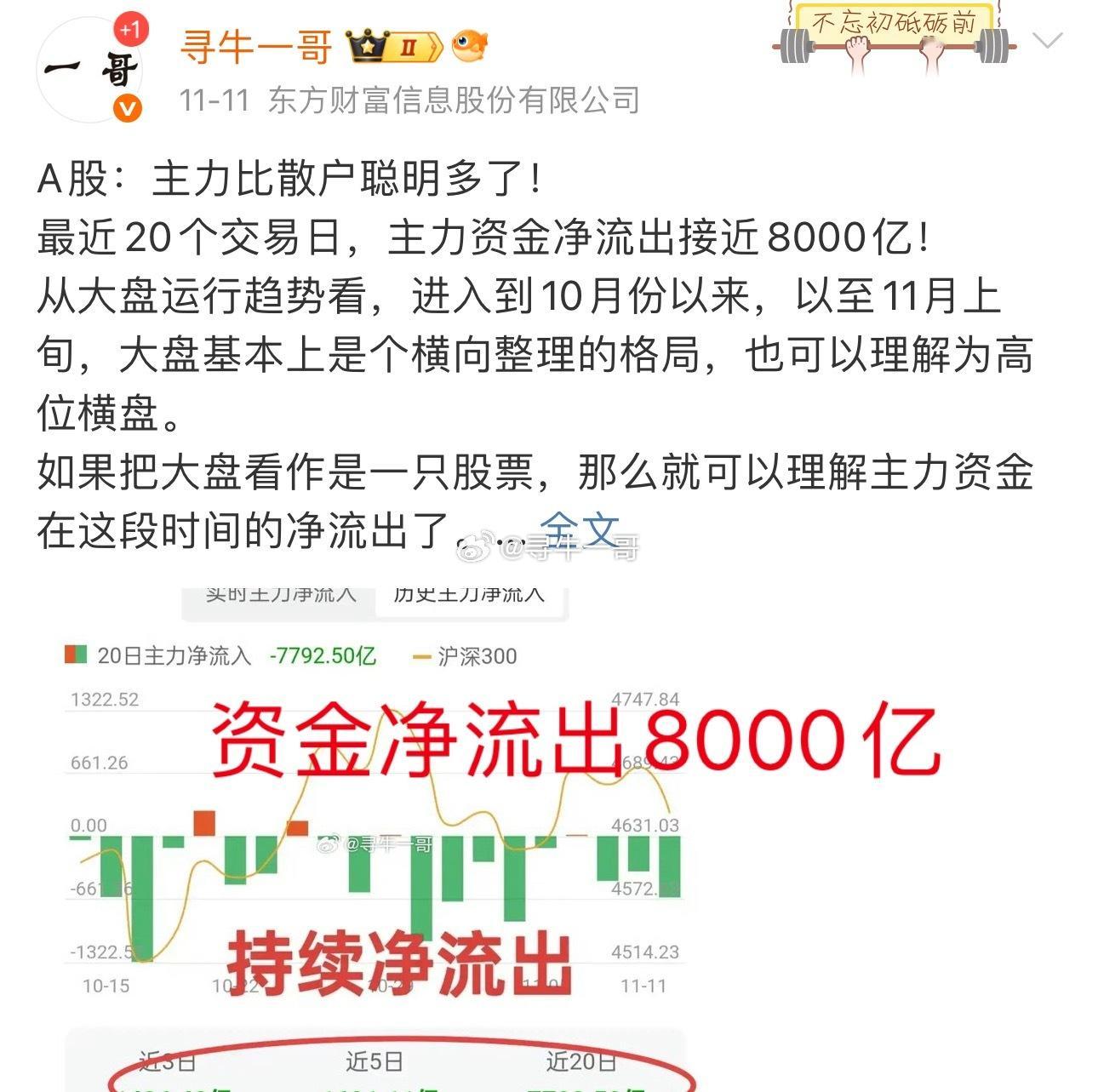 A股:一哥惊呆了,一夜又蹭蹭涨粉!因为一哥对大盘走势判断精准:19日预测大盘迈向3843点(图)。牛市结束了吗?下周会反弹吗?首先感谢股友们的厚爱一,趋势的重要性实际上,大盘涨到4000点一线的时候,一哥多次警示过市场风险。11日,一哥说主力资金20个交易日净流出8000亿(截止昨天,这个数据超过1万亿,图2和图4)。14日,预测深成指会剑指13000点,创业板会跌破3100点(图3)。PS:本周深成指收盘12538点,创业板收盘2920点,上证综指收盘3834点。21日(周五),一哥担心有些朋友会忍不住抄底。分别在10.30左右,13.00左右发文提醒:下午还可能创新低(图5)。有人说一哥是马后炮。实事求是地说,昨天市场的大跌是超过预期的——太惨烈了,妥妥的“股灾”式下跌。但,即便昨天大盘不暴跌,后市大盘依然会向预测的方向发展。这是趋势!PS:不少朋友参考了一哥的观点,或清仓或减仓,保持了账户的流动性,规避了市场暴跌风险。可喜可贺!二,后市展望对于后市,一哥有两个观点:1,牛市没有结束。2,下周大盘会反弹。不说别的,单从成交量角度来说吧。2015年大盘涨到5178点之前,沪市单日最大成交金额大概是1.2万亿左右。本次大盘从3040点开始至今,单日最大成交金额是1.3万亿左右。2015年5178点的时候,沪深两市总市值70万亿左右。目前沪深两市总市值已经超过了100万亿。两相比较,单日成交金额1.3万亿,应该还没有到达峰值。估计沪市成交金额峰值会达到2万亿水平。暴跌之下,下周大盘出现反弹是大概率。能不能参与呢?主力在3900~4000点区域出货了,大概率不会那么快把装进套子里的散户放出来。这一次下跌是市场周期性调整的一部分,市场重构需要时间。未来市场成交量会呈现继续缩小的状态,目的是沉淀市场筹码。基于以上,对市场反弹要理性对待,做好“持久战”的心理准备。个人认为,部分一直阴跌不止的股票,在大盘暴跌的时候,放出了“巨量”,出现快速下跌,可以考虑中线眼光介入。PS:回头看看四月初大跌的时候,那些底部放量的股票,大多数是获利匪浅的。个人观点,仅供参考,对错勿怪!理财有风险,投资需谨慎!