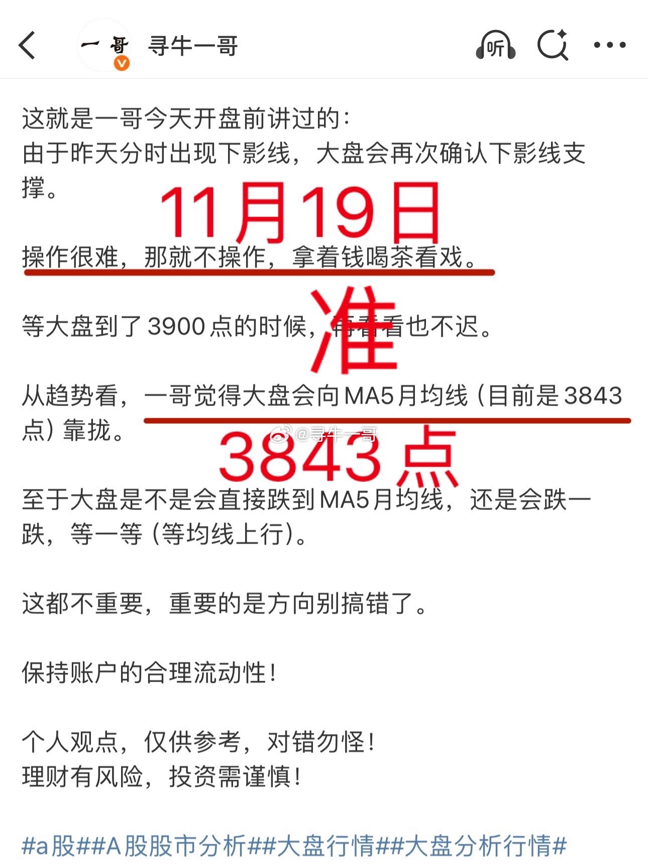 A股:一哥惊呆了,一夜又蹭蹭涨粉!因为一哥对大盘走势判断精准:19日预测大盘迈向