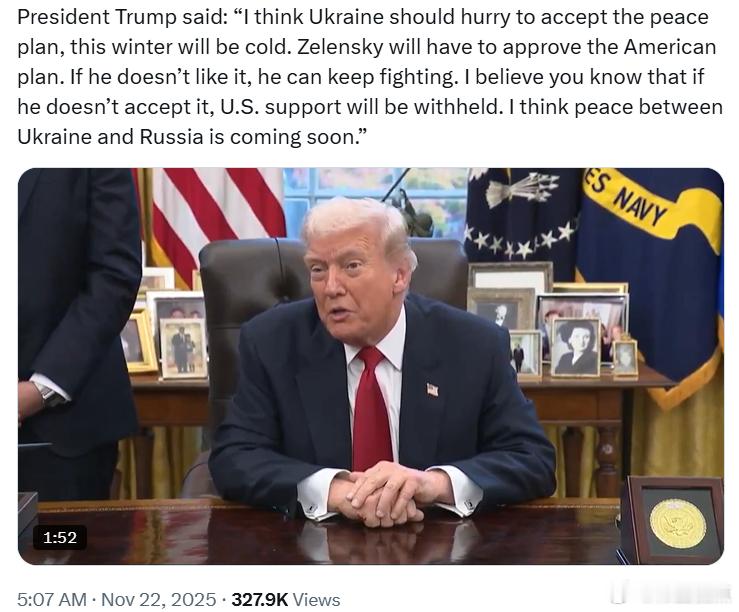 特朗普总统表示:“我认为乌克兰应该尽快接受和平计划,这个冬天会很冷。泽连斯基必须批准美国的计划。如果他不喜欢,他可以继续作战。我相信你们知道,如果他不接受,美国的支持将会被扣留。我认为乌克兰和俄罗斯之间的和平很快就会到来。”