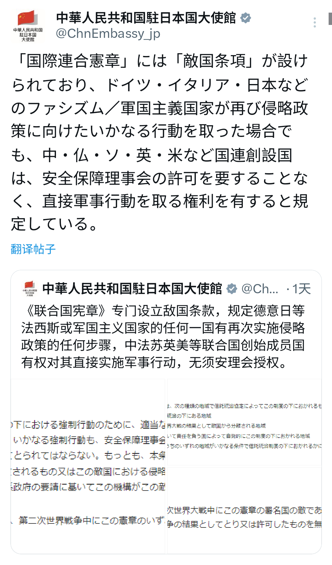 「国際連合憲章」には「敵国条項」が設けられており、ドイツ・イタリア・日本などのファシズム/軍国主義国家が再び侵略政策に向けたいかなる行動を取った場合でも、中・仏・ソ・英・米など国連創設国は、安全保障理事会の許可を要することなく、直接軍事行動を取る権利を有すると規定している。《联合国宪章》专门设立敌国条款,规定德意日等法西斯或军国主义国家的任何一国有再次实施侵略政策的任何步骤,中法苏英美等联合国创始成员国有权对其直接实施军事行动,无须安理会授权。