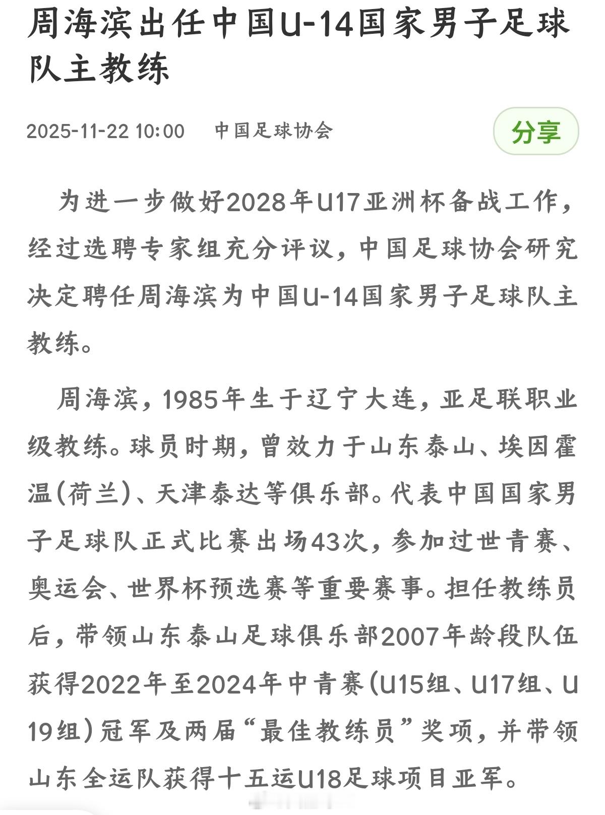 周海滨出任中国U-14国家男子足球主教练 为进一步做好2028年U17亚洲杯备战工作, 经过选聘专家组充分评议,中国足球协会研究 决定聘任周海滨为中国U-14国家男子足球队主 教练。 恭喜周指导