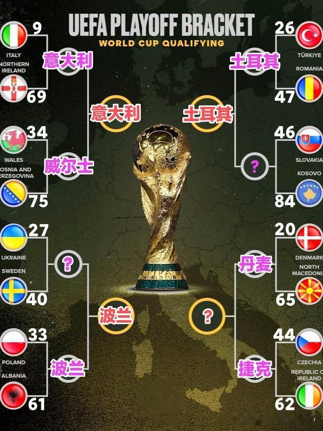 欧足联真牛,弄个小世界杯! 意大利被保送,波兰和土耳其希望很大,科索沃或黑马! 2026世界杯欧洲区附加赛于近日抽签完毕,16支球队将争夺最后4个世界杯名额。欧足联将附加赛包装成一个类似世界杯的赛事,打进四强即晋级2026世界杯。 作为种子队的意大利、丹麦、土耳其和乌克兰,命运可能有所不同。意大利和土耳其锁定两个世界杯名额,应该问题不大;乌克兰可能要连续面对瑞典和波兰,想要给战乱中的人民带来激励有点困难,有莱万加持的波兰晋级几率更大;丹麦将要面对捷克和爱尔兰的胜者,也够喝上一壶,三者谁胜出都有可能。 以上均为个人观点,欢迎关注世界杯、爱足球的友友们积极评论、交流。 2026美加墨世界杯 世界杯欧洲区预选赛 意大利队重返世界杯面临哪些挑战