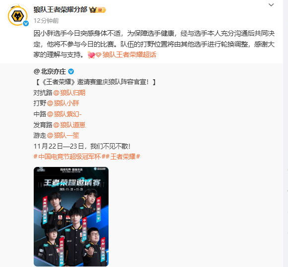 虎扑11月22日讯狼队发文:因小胖选手今日突感身体不适,不参与今日的比赛,原文如下: